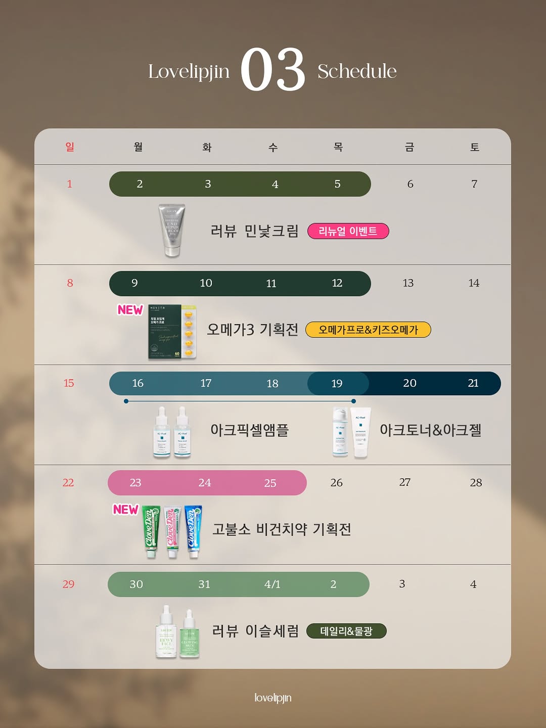 3월에 진행되는 다양한 기초 화장품 및 건강 제품의 리뉴얼 및 기획전 이벤트로, 민낯크림, 오메가3, 아크픽셀앰플 등 총 7종의 제품을 소개합니다. 각 제품은 피부 개선 및 건강에 도움을 주는 필수 아이템입니다.