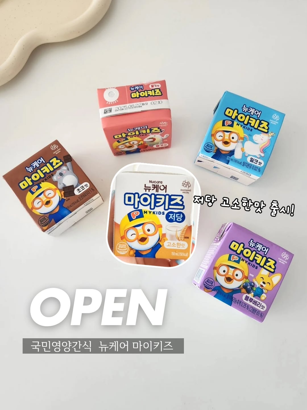성장기 아이들을 위한 영양간식 마이키즈. 3박스 이상 구매 시 추가 증정 이벤트 진행 중. 당류 4%의 저당 고소한맛 출시!