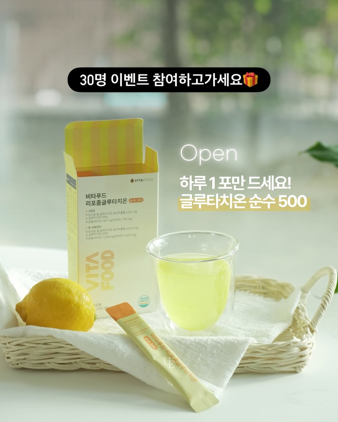 리포좀 글루타치온 본품 한 박스씩 선물로 드립니다. 500mg의 글루타치온과 비타민C를 포함한 제품으로, 흡수율을 높인 리포좀 공법을 적용했습니다.