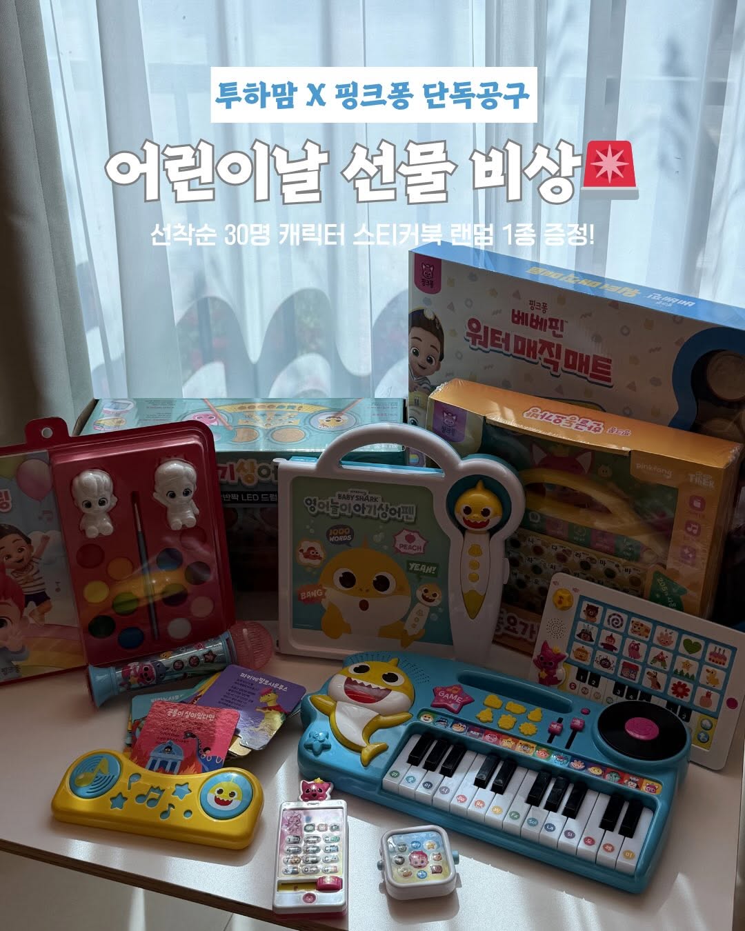 [공구오픈] 핑크퐁 어린이날 대잔치 💌 구매를 원하시면 댓글에 ‘링크’ 남겨주세요 구매하실 수 있는 링크 DM으로 바로 보내드릴게요! 🎁 선착순 구매 이벤트 선착순 30명 👉캐릭터 스티커북 랜덤 1종 증정! 🦈아이들 세계관 최강자 핑크퐁 · 아기상어 · 베베핀까지 총출동🎉 백화점 정가는 부담되고, 검색하면 가격도 구성도 애매했죠? 👉 이번 어린이날, 투하맘이 제대로 준비했어요 오직 공구에서만 가능한 혜택 + 라인업 이 안에 없는 거 거의 없어요. 💖 [공구 구성 안내] ① 핑크퐁 한들동요가방 (공구가 2만원대) 🎶 동요도, 놀이도, 학습도 한 가방에 쏙! * 버튼 무려 40개 * 총 205가지 사운드 * 어디든 들고 다니기 좋은 손잡이형 ② 베베핀 멜로디 운전놀이 + 스마트워치 (2만원대) 🚗 “베베핀 내비 켜고 출발합니다!” ✔ 피아노/색깔/탈것 모드 ✔ 베베핀 자동차 동요 5곡 ✔ 워치: 한글동요 6곡 + 영어동요 6곡 👉 투하맘 추천 세트 ③ 핑크퐁 마이크 + 아기상어 스피커 (2만원대) 🎤 상어가족송 좋아하면 무조건 ✔ 상어가족송 8곡 ✔ 인기동요 8곡 ✔ 효과음 + 음성증폭 마이크 기능 스피커는 ✔ 동요카드를 꽂고 버튼만 누르면 언제 어디서나 노래를 들을 수 있어요! ④ 핑크퐁 영어놀이 아기상어펜 (공구가 4만원대) 🐟 아기상어랑 신나는 영어 시간! * 28가지 테마, 1,000개 영단어 * 숫자놀이, 역할놀이까지 가능 * 생활 속 영어습관 잡는 데 딱! ⑤ 핑크퐁 스마트폰 + 동요패드 세트 (공구가 2만원대) 📱 엄마 아빠 폰 대신 이걸 쥐여주세요! * 동요패드 : 한글/영어 모드 지원 * 핑크퐁 스마트폰 : 전화놀이, 문자놀이 가능 ⑥ 핑크퐁 드럼 + 피아노 세트 (공구가 6만원대) 🥁 오감놀이의 끝판왕! * 드럼 두드리며 박자감각 쑥쑥 * 피아노 연주하며 멜로디 감각도 쑥쑥 * 핑크퐁 동요까지 지원되는 알찬 구성 👉 악기+놀이+음악교육이 한 번에! ⑦ 베베핀 워터매직패드 + 미니스티커북 (2만원대) 💦 물로 하는 미술놀이 (잉크 걱정 X) ⑧ 베베핀 물감컬러링 (1만원대) 컬러링북 16장 + 물만 묻혀 칠하는 고체 물감 컬러링 피규어까지 있어요! 🔥 이 구성, 온라인 어디에도 없습니다! 🎄 어린이날 시즌 + 생일 시즌 지금 사두면 제일 잘한 소비가 될거랍니다! 📌 타이거몰 가입 후 구매 가능 📌 쿠폰 적용 불가 🚚 배송 안내 4/30 주문건 → 5/1(노동절) 휴무로 👉 5/4부터 순차 출고 예정입니다! 📌 어린이날 전 수령 원하시면 👉 4/29까지 주문 권장드려요! ㅡㅡㅡㅡㅡㅡㅡㅡㅡㅡㅡㅡㅡㅡㅡㅡㅡㅡㅡㅡㅡㅡ 📢 공구 기간 | 4월 27일(월) ~ 4월 30일(목) 📌 프로필 링크에서 구매 가능!