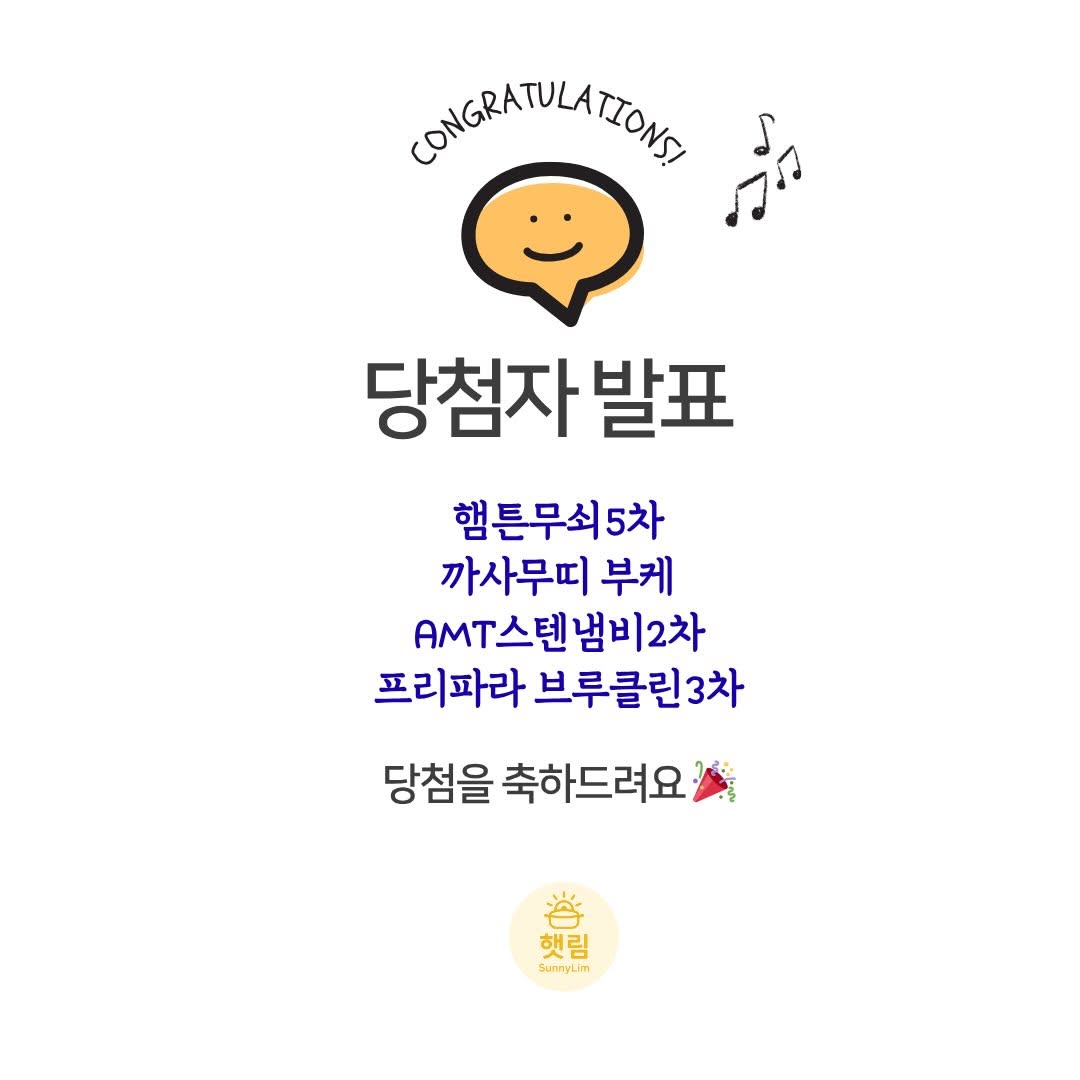 📢햇림마켓 이벤트 당첨자 발표 🥳 안녕하세요, 햇림입니다🙇♀️ 항상 햇림마켓을 믿고 함께해주셔서 진심으로 감사드립니다💛 기다려주신 햄튼 / 까사무띠 / AMT / 프리파라 브루클린 ✨써보기 & 구매 이벤트 당첨자 발표드립니다🎉 ‼️까사무띠 당첨자 분들은 👉🏻프로필링크에 있는 ‘까사무띠 당첨자 정보입력’ 폼에 정보 입력을 꼭 해주셔야 상품 발송이 됩니다⭐️ 홈쇼핑 특성상 개인정보 취합이 어렵습니다🙏🏻 4.12(일)까지 기간내에 꼭 입력 부탁드립니다!! ⚠️ 나머지 써보기 이벤트 당첨자 분들과 연락처 변동사항 있으신 분들은 4.12(일) 자정까지 👉🏻전화번호, 주소, 성함 💌디엠 보내주세요! 주소, 연락처 취합 후 상품 일괄 발송 됩니다🚛 (변동사항 없으시면 기존 수취인 주소로 상품 보내드려요!) 🌸 당첨자가 많아 사진 속 성함+전화번호 뒷자리로 확인해 주세요! 💛햄튼 무쇠 써보기 당첨자 •베이비웍 18cm(써보기) @j_rirang •후라이팬 24cm(써보기) @seonhee83 💛까사무띠 써보기 당첨자 다다닥 💛AMT 사각컴바인팬 써보기 당첨자 @choijy312 @tosay51 💛프리파라 브루클린 7P 써보기 당첨자 @5hadoong2 미라클 김길자-w7w 당첨되신 모든 분들 축하드립니다🥳 과분한 사랑에 늘 보답하는 햇림이 되도록 노력하겠습니다! ‼️냉동부터 오븐,에프까지! 내열에 진공까지? ✨진공내열 밀폐 유리용기 네오플램 글라쎄z프로 공구중🔛 📌프로필 링크로 오세요👋🏻 🔜신상 벚꽃에디션🌸 스팀홀 있는 원형뚜껑까지! ✨바첸 쿠커블웨어 공구는 📆4.14(화)에 만나요👋🏻 #햇림마켓