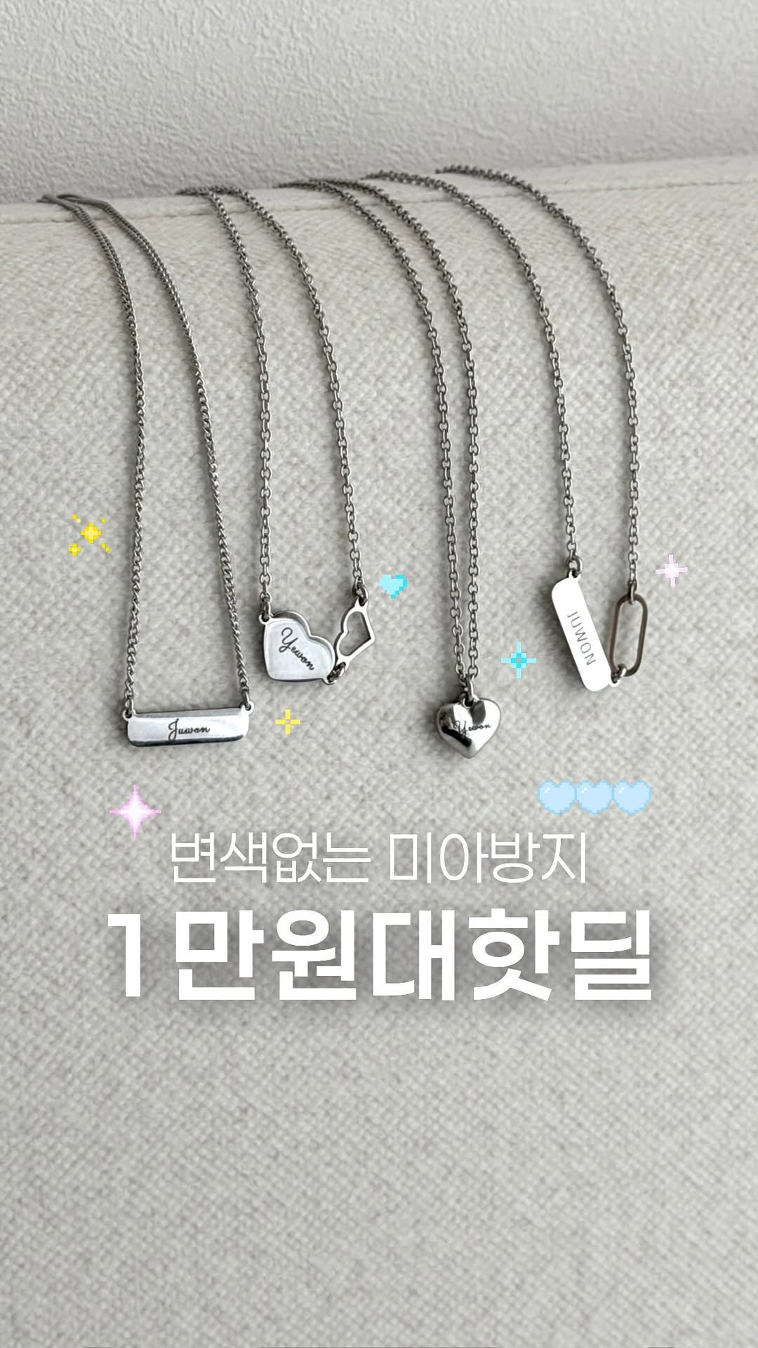 뮤주벨의 미아방지 목걸이와 팔찌는 세련된 디자인과 변색 없는 써지컬 스틸로 제작되었습니다. 양면 각인이 가능하며, 부담 없는 가격으로 제공됩니다.