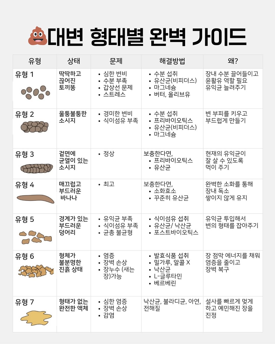 소중한 사람에게 공유🧡 저장하고 매일 확인하기! 📌 1️⃣ 토끼똥처럼 딱딱하고 자꾸 끊긴다면? (유형 1,2) 대장이 변을 너무 꽉 붙잡아서 수분을 다 뺏긴 상태예요. 너무너무 힘들죠 🥺 이럴 땐 대장 운동을 도와주는 유산균이랑 변을 부드럽게 해주는 마그네슘 조합이 최고 장에 수분을 듬뿍 넣어주세요 💧 2️⃣ 진흙처럼 묽고 형태가 없다면? (유형 5~7) 장벽이 약해져서 염증이 생겼거나, 유해균들이 장악했다는 신호예요😱 유산균보다 낙산균이 시급해요! 장 점막 세포에 에너지를 팍팍 채워줘야 장벽이 튼튼해지면서 변 형태가 예쁘게 잡히거든요. 여기에 +글루타민도 효과좋아요! 3️⃣ 매끄러운 황금 바나나 변! (유형 3, 4) 지금 아주 건강한 상태예요 🎉 지금 상태를 잘 유지하려면 균들의 먹이인 프리바이오틱스랑 소화를 돕는 효소를 챙겨줄 수 있어요! 🤔저는 6번인데 가스도 엄청 차요. 왜 이럴까요? 글로 다 못 담은 디테일한 고민은 혼자 앓지 말고 바로 댓글 남겨주세용! 그동안 장 건강 고민으로 잠 못 잤던 분들을 위해 제가 야심 차게 준비한 프로젝트였지용 ㅎㅎㅎ ✨ 슈.장.프 (슈퍼 장 만들기 프로젝트)! ✨ 장 상태에 딱 맞는 제품만 골라드릴게요:-) 다음 주부터 본격적으로 시작하니까 기다려주세요! 우리 같이 황금변 위해!!