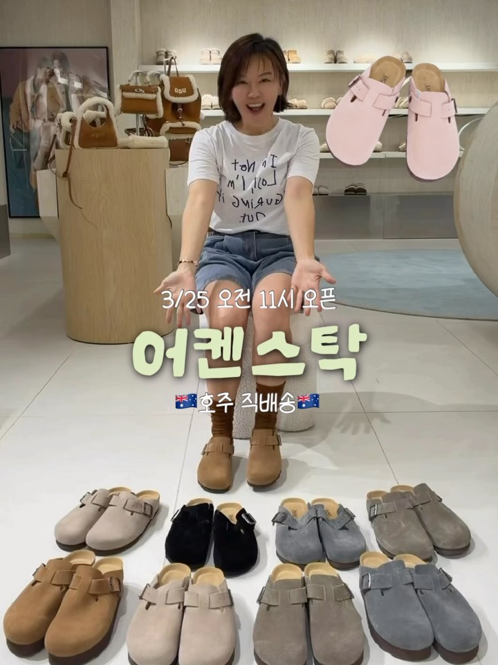 🎥 3/25 오전11시 라이브 🎥 현지 쇼핑몰에서 ’세일‘하는 가격이 99불인거 보이시죠??? 🤭 ✨가격 확정 ✨ 우리는 6-7만원대입니다 ‼️‼️‼️‼️ 📌 댓글에 좋아하는 이모티콘 아무거나 남겨주시면, 3/25 오픈때 알람 드려요 💖 컬러 고르셨어요??? 어떤 컬러할지 알려줘요😘 🖇️메리제인 (2.5cm): 체스넛, 샌드, 블랙 (225~255) 🖇️낮은굽 뮬 (2.5cm): 체스넛, 토프, 올리브, 핑크, 그레이, 블랙 (230~285) 🖇️플랫폼 뮬 (4cm): 체스넛, 토프, 핑크, 올리브, 그레이 (230~250) 낮은굽 뮬은 커플 가능해요 👨🏻👩🏻 어그 신상 소개해드리려고 호주에 이사 왔나봐요 🇦🇺😆 제~~~일 처음으로 보여드리는 디자인이 가득❣️ 봄에 특히 더 예쁜 스웨이드 뮬 슬리퍼 🤩 영상 속 디자인 (낮은 굽 or 플랫폼 굽) 뿐만 아니라 메리제인 디자인도 추가하고 시크릿 컬러까지💖💖💖 버*스탁 홈페이지 들어가니까 20만원이 훨씬 넘더라구요 🫣 더 부드러운 스웨이드에, 폭신한 메모리폼 밑창인데, 6~7만원대면 이하면…. 🤭 진짜 안 할 이유 없죠?? 😉