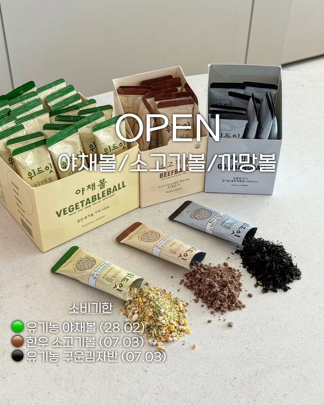 유기농 야채볼/소고기볼/까망볼 OPEN! 💟 선착순 30분 / 구매자 랜덤 30분 네이버페이 포인트 💟 구매완료 댓글을 달아주시는 분들 중 추첨을 통해 까망볼을 보내드립니다 ( * 구매완료/최*희+8810) 그동안 문의 많았었던 볼 시리즈 ! 3개월만에 돌아왔습니다 ☝️ 유기농 야채볼과 소고기볼에서 유기농 까망볼까지 추가된 구성으로 최대 할인가로 준비됩니다 어떤요리에도 한포 톡톡 넣어주면 간편하고 영양 가득한 요리가능 ! 특히, 워킹맘들에게는 단비같은 잇템 소량의 물만 있으면 원물로 돌아가는 야채볼과 소고기볼은 뜨끈한 밥에 섞어서 주먹밥으로도 좋고 , 죽, 국 , 반찬 등 다양하게 활용 할 수 있답니다 이번에 새로 같이 보여드리는 까망볼은 유기농 김을 튀기지않고 고소하게 볶아내 야채볼, 소고기볼과 꿀조합으로 사용해보세요 🍙 유기농 야채볼 ▫️유기농 브로콜리,당근,표고버섯,연근,단호박 모두 국산 ▫️물만 있으면 모든 요리 가능 ▫️해동,세척,절단,손질 필요없이 그대로 사용 ▫️부드러운 식감으로 이유식부터 사용 ▫️영하 40도 동결건조로 영양 보존 ▫️실온보관과 스틱 소분 포장 🐮 한우소고기볼 ▫️1등급 한우를 소고기볼로 간편하게 ▫️고기준비 5초 빠른 조리시간 ▫️고기손질 없이 영양가 있는 소고기를 상온에 보관 ▫️유기농 무와 소고기의 궁합 ▫️간단히 즐기는 고단백 소고기요리 🍙 유기농 까망볼 ▫️기름없이 구운 국내 최초 김자반 까망볼 ▫️100% 유기농 국산 프리미엄 원재료 ▫️97% 이상 원초김 최고 함량 ▫️소금없이 고소한 풍미 ▫️스틱형 포장으로 휴대 간편 📌 일정 : ~ 4/26 ( 주말까지 진행되는 일정입니다 ) 📌 구매: @myunghee_homecook 제프로필 하단 링크에서 구매가능하세요 📌 구성 : 단품 / 셋트 링크 따로 올려두었습니다 ( 무료 배송 조건으로 든든히 쟁여두세요 ) 📌 소비기한 : 🟢 유기농 야채볼 (28.02) 🟤 한우 소고기볼 (07.03) ⚫️ 유기농 구운김자반 (07.03) 💟 선착순 30분 / 구매자 랜덤 30분 네이버페이 포인트 💟 구매완료 댓글을 달아주시는 분들 중 추첨을 통해 까망볼을 보내드립니다 ( * 구매완료/최*희+8810)
