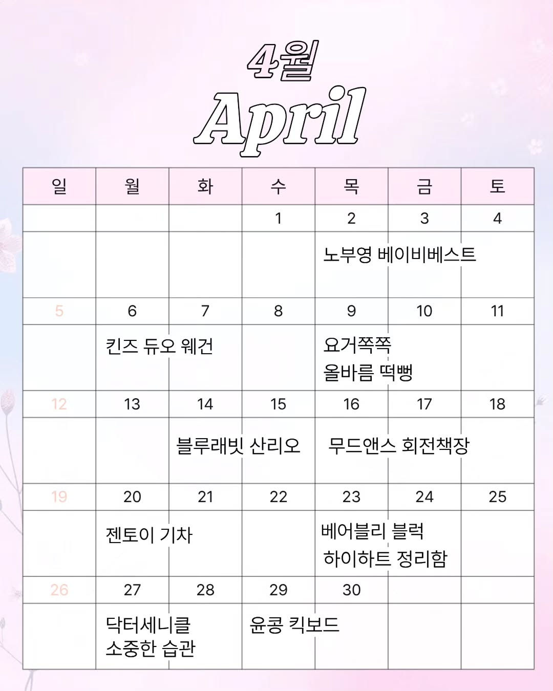 2026년 4월 공구 일정📅 봄봄봄봄 봄이 왔어요~🌸 날씨가 넘 따스해져... 아기랑 매일 나가고 싶은 요즘!! 이번주는 벚꽃 구경을 하고 올까봐요~ 이번달은 나들이 준비 + 어린이날 특집으로 준비했어요~ 보시고~ 필요하신 제품만 최저가로 구매하세요!! 라인업 좋은 벨라맘 공구💙 놓치고 싶지 않다면 -> 공구 공지방에 들어오세요! 가장 먼저 링크 받으실 수 있습니다. ->댓글에 [초대] 남겨주시면 공지방 링크 보내드릴게요! ___ 4월 2일: 노부영 베이비 베스트 6일: 킨즈 듀오 웨건 9일: 요거쪽쪽, 올바름 떡뻥 14일: 블루래빗 산리오 골라담기 16일: 무드앤스 회전책장 20일: 젠토이 기차 놀이 세트 23일: 베어블리 블럭, 하이하트 정리함 27일: 닥터세니클, 소중한 습관 29일: 윤콩 킥보드 ___ 관심 있는 제품은 아래 키워드로 대댓글 남겨주시면 알림 드릴게요!⏰ 수동으로 안내드려 살짝 늦을 수도 있어요 💕 ✔️노부영 ✔️웨건 ✔️요거 ✔️떡뻥 ✔️산리오 ✔️책장 ✔️기차 ✔️블럭 ✔️정리함 ✔️손소독 ✔️소중해 ✔️킥보드 궁금하신 점이 있으시다면 💌저한테 DM 남겨주세요!!💌 #4월일정 #노부영 #웨건 #소프트블럭