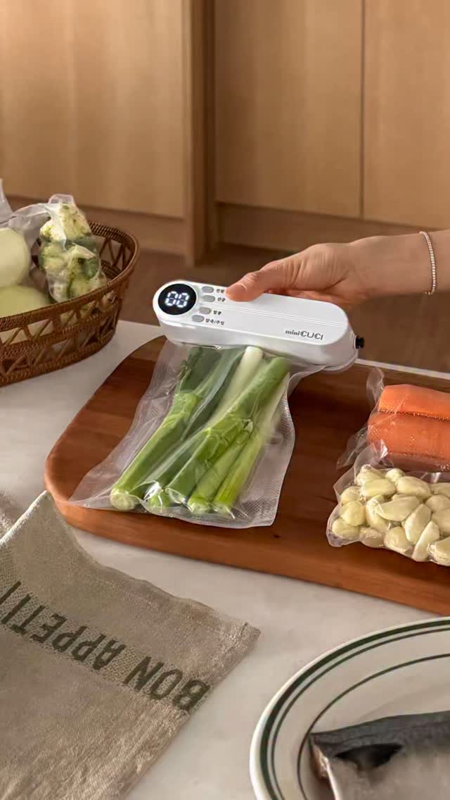 남은 재료를 버리지 않고 신선하게 보관할 수 있는 진공포장기입니다. 버튼 하나로 공기를 빼고 밀봉하여 야채, 반찬, 이유식 등을 오래 보관할 수 있습니다.