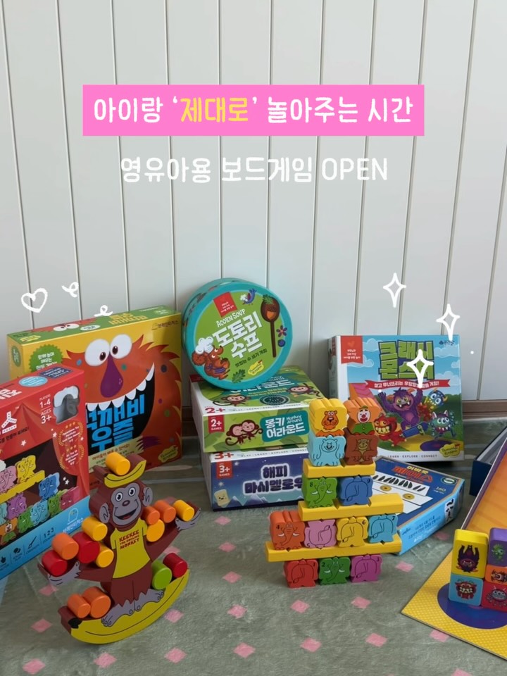 ❤️공구중 16일마감 👉 [보드게임] 댓글 남겨주시면 오픈 직후 링크 보내드릴게요 (오전에 알림 잘못 받으신 분들 🙏 여기 댓글 주시면 다시 보내드릴게요!) ㅡ 🎁구매완료이벤트 구매완료+ 핸드폰 뒤4자리 댓글 남겨주시면 3분께 네이버포인트 5,000원씩 보내드릴게요 💛 ㅡ 내 아이와 찐 상호작용하며 놀면서 똑똑해지는 보드게임 ✨ 종류 살펴보시고 어떤걸 골라야할지 어려우시면 DM주세요. 개월수 알려주시면 맞춰서 추천드릴게요! 아이 성향이나, 엄마가 어떤것에 중점을 두고 사고자하시는지 알려주시면 더 좋아요 :) ㅡ ✨공구 라인업 2세 이상 ~ 크래시몬스터 / 몽키어라운드 3세 이상~ 해피 마쉬멜로우, 짐보스, 표정짝맞추기 게임 먹깨비 우즐, 도토리수프, 매쓰샌드위치 어바웃페이스 , 흔들흔들키키 🤔집에서 매일 하는 고민, 뭐하고 놀아주지? 고민 끝에 장난감, 책읽어주기, 스티커 붙이기만 하셨다면 이제 보드게임도 한번 들여보세요 .ᐟ ㅡ 나중에 유치원, 학교 가면 보드게임 수업 하는곳들 많거든요 저희 첫째는 집에서 해봤던 경험이 있어서 👉 규칙 이해도 빠르고 👉 기다리는 것도 자연스럽고 👉 자신감 있게 참여하더라구요 그때 느꼈어요 “아 이게 그냥 노는게 아니었구나” 단체생활에서 제일 어려운게 기다림, 규칙인데 이건 미리 놀이로 경험해보는게 진짜 달라요 ㅡ 소근육도 필요하고, 집중력도 물론 필요해요. 한번에 잘하게 되는게아닌 조금씩 계속 같이 하다보면 진짜 놀면서 똑똑해지는 그런 놀잇감인거죠. 그래서 이번에 두돌부터 시작할 수 있는 보드게임들만 모아서 가져왔어요 ✔ 규칙 어렵지 않고 ✔ 처음 접하기 좋은 구성 👉 “첫 보드게임”으로 딱이에요 ㅡ 무엇보다 진짜로 엄마랑 상호작용하며 노니까 아이가 보드게임하는시간을 정말 행복해해요. 이 경험 꼭 느껴보시길 !ㅎㅎ 👉 [보드게임] 댓글 남겨주시면 오픈 직후 링크 보내드릴게요