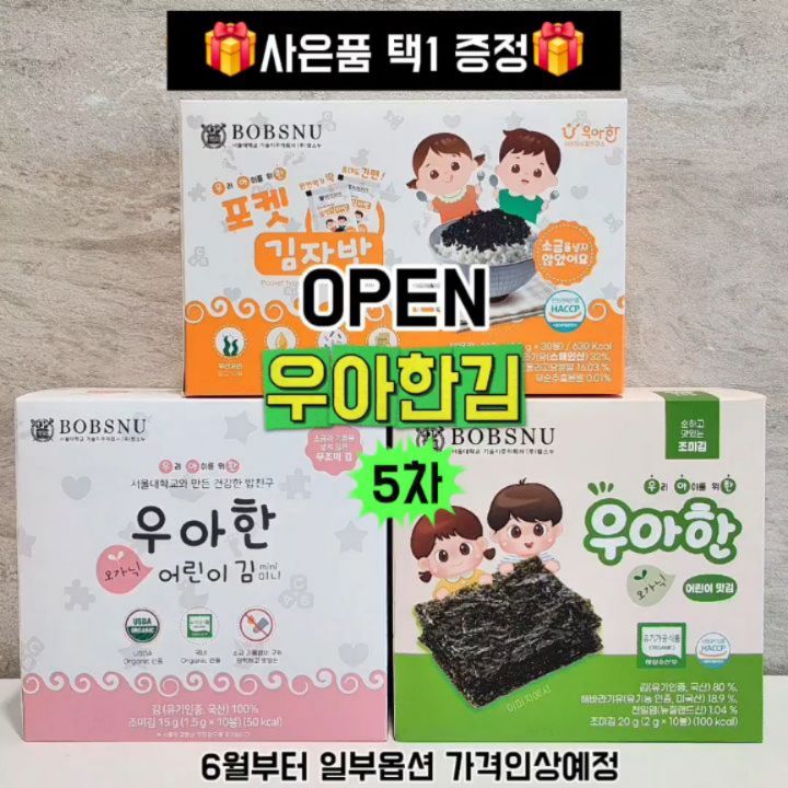 #5차공구오픈 🗓3월 25일 오전 10시 오픈🗓 💚우아한김 모음전💚 📌일부옵션 6월부터 가격인상 예정📌 📢 다음 공구 6월이후입니다 ! 쟁여주세요✋️ 🚨링크 필요하신분들은 댓글에 '링크'적어주세요🚨 🚨오픈시, 구매링크 DM으로 보내드릴게요!🚨 - 3년 이상 바다, 양식장, 생산시설까지 화학물질로 부터 완.벽.히 통제되어야 허락되는 까다로운 유기농 인증을 받은 📍우아한 김📍 - 대량 생산되는 '염산(유기산)'처리된 김과는 다르게 유기농법에 의한 김 양식은 적게 느리게 생산됩니다. 면역이 완성되지 않은 어린 아기들에게 먹일 수 있는 안전한 먹거리 바로, ✨️유기농김 = 우아한 김✨️이에요. - 유기농김이라고 다 같을까요? ❌️NO!❌️ 기름과 소금이 달라요. - 📌CHECK POINT 1📌 우아한김에 사용된 유기농 해바라기유는 유전자 조작을 할 수 없는 건강한 기름이에요. 발연점이 높아 잘 타지 않기 때문에 김을 구울때 높은 온도에 안정하고 불포화 지방산인 올레산이 풍부해서 건강한 먹거리에요. - 📌CHECK POINT 2📌 국내산 천일염 대신 뉴질랜드 천일염을 사용했어요. 알고 계신가요?☺️ 뉴질랜드는 미세먼지가 없어 빗물도 마실만큼 청정한 나라에요. 청정바다에서 얻은 뉴질랜드 천일염은 미세플라스틱으로부터 상대적으로 안전하고 맛도 좋아요. 짠내가 덜한 뉴질랜드 천일염을 사용했다는 점이 특별해요. - 📌특징📌 ✅️아기들 건강을 위해 불포화 지방산의 올레산이 많은 해바라기유를 사용 ✅️바다,양식장,생산설비 까지 각종 오염원을 온전히 관리하여 한국 유기 인증을 획득 ✅️깨끗하다고 알려진 뉴질랜드 천일염을 최소량으로 배합하여 짜지 않고 고소한 맛을 냄 ✅️소금/기름없이 2번 로스팅해서 맛있고 건강한 (무조미김에 해당) ✅️설탕과 소금 무첨가 (포켓 김자반에 해당) - 김 하나만 올려줘도, 반찬 걱정 하나 줄어요..🩷 - 📌추천 연령📌 ✅️무조미김 : 6개월이상 ~ (소금/기름 없어서 엄마 선택에 따라 섭취 시작해주세요) ✅️조미김 : 돌전후아기~ (사실, 어른인 제가 먹어도 맛있음..) ✅️포켓 김자반 : 돌전후아기~ 📌소비기한 안내 (최신 생산품 출고)📌 포켓김자반 : 2026년 11월 이후 / 3월 생산 무조미(분홍이) : 2027년 2월 이후 / 2월 생산 조미(초록이) : 2026년 11월 이후 / 3월 생산 유기농보리차 : 2027년 3월 이후 / 3월 생산 1분포켓국 사골미역국 : 2027년 9월 이후 / 3월 생산 1분포켓국 북어계란국 : 2027년 9월 이후 / 3월 생산 최신 상품으로 출고됩니다❤️ - 📌공구 일정📌 3월 25~29일 📌 공구 가격 📌 ✅️포켓 김자반 30봉 X 2 : 34,200원 ✅️포켓 김자반 30봉 + 무조미 50봉 : 35,900원 ✨️인기옵션 빠른 품절 예상✨️ ✅️포켓 김자반 30봉 + 조미 50봉 : 35,900원 ✅️무조미 80봉 : 32,000원 ✅️조미 80봉 : 32,000원 ✅️무조미+조미 반반 80봉 : 32,000원 ✅️유기농 보리차 20팩 : 16,400원 ✅️1분포켓국 2케이스 8팩 : 15,600원 * 추가 구매 상품 ✅️에디슨롱뻥 자색고구마/시금치/단호박 : 각 2,400원 ✔️무료배송 ✔️오후 12시 이전 주문건 당일 출고(평일/주말&공휴일 제외) ✔️제주 및 도서산간지역 택배비 추가 ✔️브랜드 or 택배사 사정에 따라 출고일 1-3일 지연 가능성 있음 - 🎁추가상품으로 국 1팩 or 이유식 파우치 1팩 증정 이벤트🎁 옵션 꼭 선택해주세요! - 📌구매링크📌 프로필 링크 참고해주세요. 📌구매인증이벤트📌 댓글에 '구매완료/폰뒷자리' 적어주세요! 총 N명 🎁네이버페이 5,000원 선물🎁드려요.