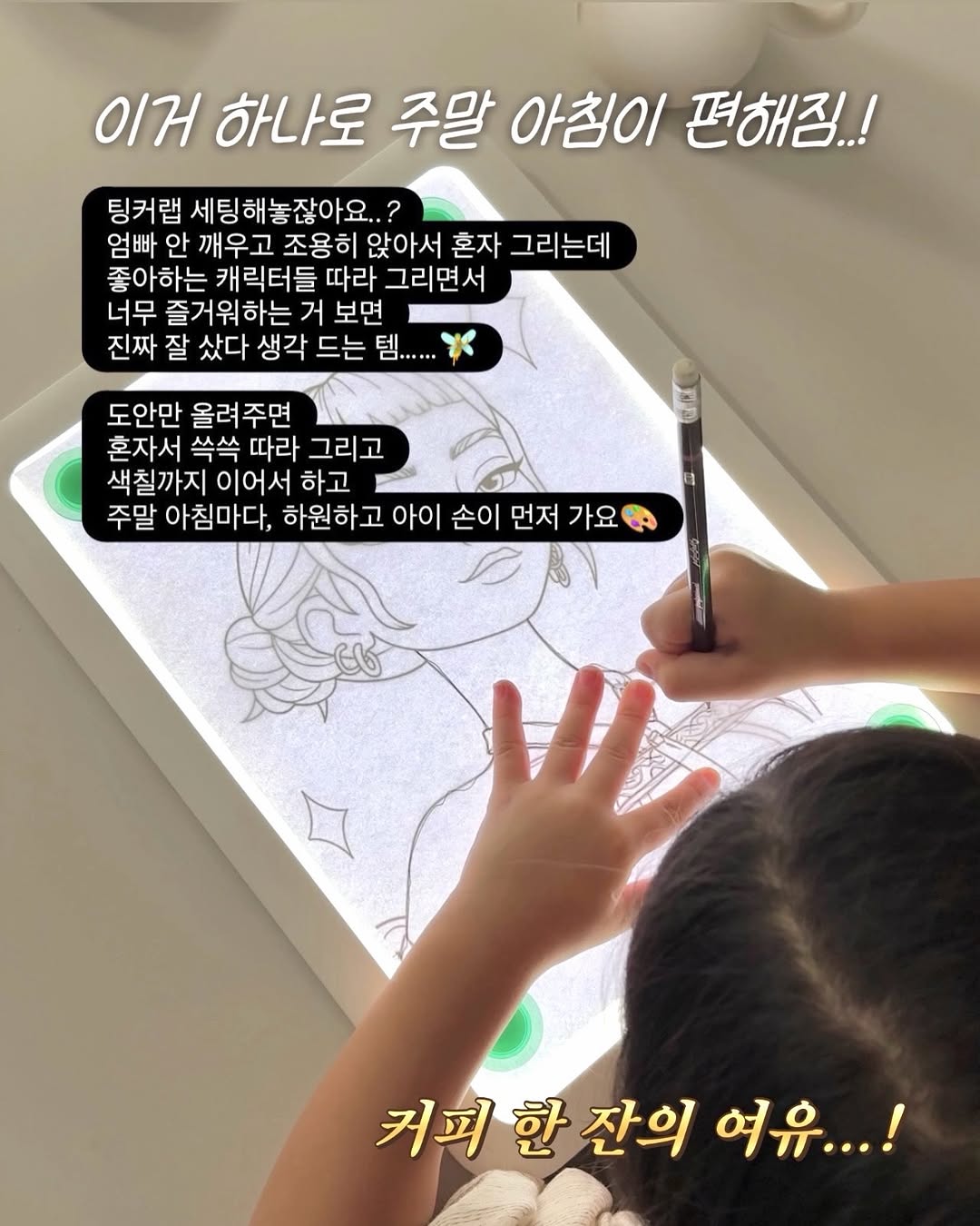 팅커랩 D-1🧚 3만원대 어린이날 선물 추천🩵 #내일오전11시오픈 솔직히 저도요 처음엔 엄마 티니핑 그려줘! 하면 바로바로 해주다가 점점 하루에 몇 번씩 반복되니까……. 어느 순간부터는 너무 힘들더라구요🙂↔️ 티니핑은 종류가 또 왜이렇게 많은지,,,,,, 게다가 제가 그려준다고 해도 니니 마음에 안 들면 또 아니야 눈이 이상해 다시!! 시작ㅋㅋㅋㅋ 근데 이거 쓰고 나서는 엄마가 옆에서 계속 해줄 필요가 없어졌어요🙅🏻♀️ 엄마가 대신 그려주는 방식 말고, 아이 스스로 따라 그리면서 실력이 쌓이는 루틴을 만들어주는 거 그냥 아이가 좋아하는 도안이랑 캐릭터를 프린터로 쭉쭉 뽑아서 라이트패드 위에 올려주기만 하면 아이는 선 따라가면서 혼자 집중 모드 들어가요 그리고 진짜 신기했던 건… 그림에 자신 없던 아이도 선이 따라가지는 걸 경험하면서 나도 할 수 있네?가생겨요 완성되는 경험이 한 번, 두 번 쌓이니까 성취감이 생기고 그게 바로 자신감으로 이어지더라구요💪🏻 아이 표정이 달라져요…엄마 봐봐! 하면서 들고 오는데 그 순간이 진짜 뿌듯해요🥺🫶🏻 📌내일 오전 11시 드디어 팅커랩 3차 공구 오픈합니다💌 제가 써보고 좋아서 직접 본사 컨택해서 진행하는 공구라 정말 너무너무 소개해드리고 싶었어요 추가로 궁금한 점 있으면 언제든지 댓글 남겨주세요🙌🏻 - ✔️ 트레이싱패드란? 그림 밑에 밑그림을 넣고 빛으로 투과시켜 따라 그리는 판이에요 ✔️ 어떻게 쓰나요? 1. 마음에 드는 그림을 출력해서 2. 트레이싱패드 위에 올리고 3. 그 위에 종이를 겹쳐놓으면 4. 빛으로 그림 선이 비쳐요! 5. 아이는 그냥! 따라만 그리면 끝🖊️ ✔️ 이런 점이 좋아요 •처음에는 따라 그리기 → 나중에는 스스로 응용 •집중력 기르고, 성취감이 생겨요 •그림 그리는 시간을 ‘놀이 시간’처럼 즐겨요 이게 그렇게 좋아요? 싶을 정도로 한 번 써보면 무조건 루틴되는 그 제품✨ 요즘 입소문 타고 이미 사신 분들도 많으신데 후기들이 진짜 하나같이 너무 좋아요….. 무려 네이버 스스도, 공홈도 평점 4.9로 🌟 2천개가 넘는 후기가 증명합니다💯 ✔️ 그림 자신 없던 아이도 ✔️ 집중력 짧던 아이도 ✔️ 성취감 뿜뿜하게 도와주는 하루에 한 시간만이라도 미디어없이❌ 조용히 집중할 수 있어요💪🏻 엄마에게도, 아이에게도 최고의 선물🎁 공구가가 가장 저렴하니 이번기회 놓치지마세요🩵 - ☑️LED드로잉패드 + 팅커랩 종이 용지 20매 (리뷰 약속 선물증정) 정상가 79,800원 🔜공구가 39,800원 ☑️ 트레이싱 그림 따라 그리기 도서📚 (구매하시면 5,000원 상당의 용지정리함+무료배송) 정상가 18,000원 🔜 공구가 12,600원 ☑️팅커랩 종이용지 100매 🔜 공구가 5,000원 -
