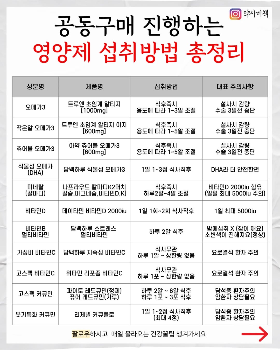 🔻2026상반기 공동구매 진행하는 영양제 가이드🔻 1️⃣ 성분별로 2️⃣ 공구 진행 해드리는 제품명 3️⃣ 표준 섭취 방법 4️⃣ 섭취 주의 사항 간략히 정리해 드렸습니다. ✅️ 각각의 상세 가이드는 ➡️ 제 프로필 링크에 ➡️ "공구영양제 가이드 notion 정리" 확인해주셔도 좋습니다. 문득 정리하다 보니 요청하시는거 추가한게 이렇게나 많아졌네요 😅 믿고 함께해 주셔서 항상 감사드립니다. 건강과 관련된 거라면 언제든지 말씀주세요 실망없는 제품과 정보들만 소개 드리겠습니다🔥 @yak_secret #영양제섭취방법 #영양제추천 #영양제공구