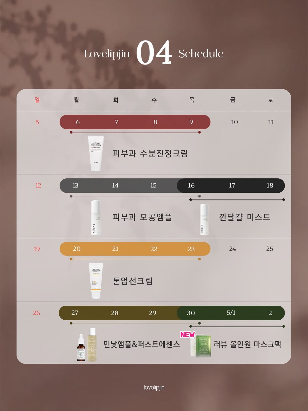 4월에 진행되는 다양한 뷰티 제품 공동구매 일정입니다. 수분크림, 모공앰플, 미스트, 톤업선크림 등 다양한 제품이 준비되어 있습니다.