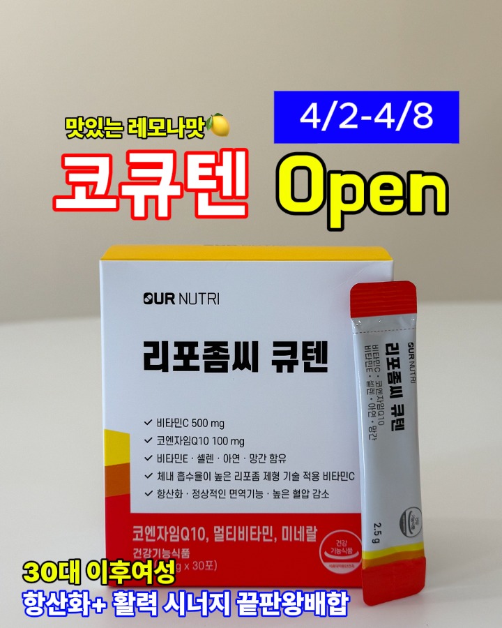 📢맛있는 레모나맛🍋 [ 코큐텐+리포좀비타민C ] #공동구매 Open합니다! ✔️일정 : 4/2 - 4/8 안녕하세요 릴친님들! 굳모닝입니다🙂 잠시후 오전10시, 항산화네트워크 구성 끝판왕조합 레모나맛 리포좀씨큐텐 드디어 오픈합니다 ✓코큐텐100mg ✓리포좀비타민C 500mg ✓비타민E/셀렌/아연/망간 약사가 성분배합에 참여한 항산화네트워크의 핵심성분으로 똘똘뭉친 아주 기특한 제품입니다 ✅공동구매 특별혜택 금액안내 ✓1박스 = 30포 1️⃣4박스 156,000원 ➡️116,900원 25% off 1박스 29,225원 2️⃣8박스 312,000원 ➡️199,900원 36% off 24,988원 ✅ 공동구매 구매이벤트 최다구성 구매시 총 10분 추첨해서 1통 더 선물보내드려요! (업체에서 자동선정) ✓소비기한 2028.01.11 ✓공구주기 4개월 예정 ✅ 찾기 힘든 가루형태의 맛있는 코큐텐 항산화네트워크 과학적설계 올인원제품이 필요하신 분은 많은 도움이 되시기를 바랍니다! [ 제품특징 ] 1️⃣ 맛있는 가루 코엔자임큐텐🍋 이렇게 맛있는 “가루”코큐텐 어디에도 없을거에요🍋 레몬맛으로 상큼하게 맛을 잘 잡았는데 코큐텐을 무려 100mg 담았습니다 2️⃣ 코큐텐 100mg+ 리포좀비타민C 500mg 리포좀비타민C 만도 따로 많이 챙겨드시죠 핵심배합을 담은것 뿐 아니라 각각을 따로 챙겨드시는것보다 금액적인 메리트도 훨씬 뛰어납니다 (최다구성 기준 1박스 2만4천원대입니다 그야말로 혜자 혜택이니 놓치지마세요⭐️) 3️⃣ 항산화네트워크 핵심성분 코큐텐100mg 리포좀비타민C 500mg 비타민E 셀렌 아연 망간 4️⃣ 높은혈압감소, 항산화 기능성 기능성은 식약처에서 인정한 기능성만 표기하지만 코큐텐의 실로 다양한 이점은 아마 릴친님들이라면 잘 알고계실겁니다! 여러분 말씀드리는대는 그만한 이유가 있죠! 5️⃣ 이런 분들께 정말 좋아요 활성산소로부터 건강을 보호하고 싶은 분 활력을 원하시는 분 불규칙한 식사,다이어트로 영양 보충이 필요하신 분 채소와 과일 섭취가 부족하신 분 리포좀 제형기술로 흡수율 높은 고함량 비타민C를 드실 분 항산화, 높은혈압감소 동시케어가 필요한 분 전문가가 성분, 함량 배합에 참여해 시너지를 낼 수 있는 유일무이한 조합의 제품입니다 그런데 맛도 좋으니, 기특하지 않을 수가 없네요 상큼한 레몬맛으로 저는 빌베리파우더, 글루타치온파우더와 함께 극강의 시너지 조합으로도 잘 챙겨먹습니다 잠시후 오전10시 찾아뵙겠습니다!