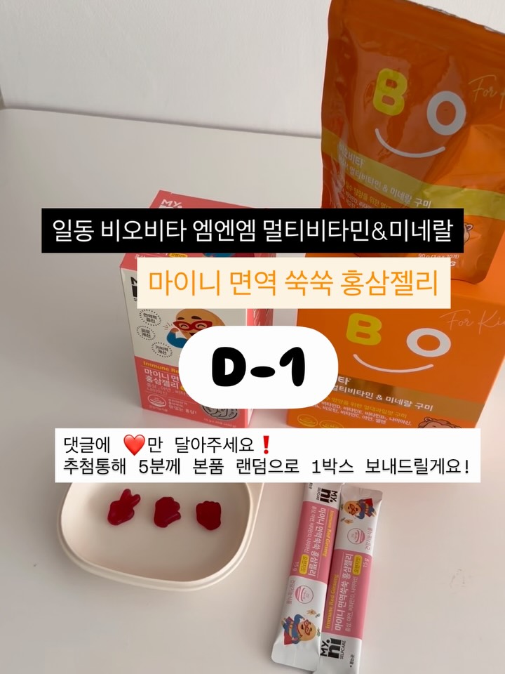 엠엔엠 멀티비타민/마이니 면역 쑥쑥 홍삼젤리 d-1 #사전예고이벤트 💟댓글에 ❤️ 달아주시면 추첨통해 5분께 엠엔엠 멀티비타민&미네랄 또는 마이니 면역 쑥쑥 홍삼젤리 중 랜덤으로 1박스씩 보내드릴게요! (이전릴스와 중복참여 가능) ❤️❤️❤️ 마구마구 날려주세요! ✔️4/14(화) 오전 10시 오픈! 👉이번에 일동으로 브랜드리뉴얼 한 엠엔엠 멀티비타민&미네랄! 그리고 이번에 새롭게 보여드리는 홍삼젤리까지! 🥲지금 갑자기 날이 더워지면서 일교차가 더 심해졌는데 아침 저녁으론 쌀쌀하고 낮엔 덥더라구요. 🤔이런 날 방심하면 또 감기 걸리기 쉬운데 가정에서 할 수 있는 최선은 바로 ❗️아이 면.역.력 길러주기! 🥹그런데.. 수많은 영양제 중 아이가 잘먹는 영양제가 있따는 건 정말 행운이더라구요. 🩶현관앞에 맨날 두고 가기 전에 먹였더니 이제 루틴이 되서 등원전에 본인이 찾아서 먹어요. 🩶그리고 이제 정말 본격적인 놀이터 시즌! 놀이터 간식… 다들 아시져? 🩶그럴 때 꼭 젤리를 하나씩 받아오는데 요거 하나씩 손에 쥐어주면 엄마도 죄책감 없고 이거 비타민 젤리야! 라고 말할 수 있어서 좋더라구요. ‼️비타민B, 비타민A, 비타민C, 아연, 셀레늄 이 엠엔엠 멀티비타민 안에 다 들어있어요. 💁몇개월부터 먹일 수 있나요? 질문이 많은데 👉보통 18개월부터 권장드리고 있어요. 이 때쯤 부터 아이들이 구미형을 잘 씹어먹기 떄문인데 만약 그 전부터 먹이실 경우 잘게 잘라서 아이 목에 안걸리는지 잘 지켜봐주세요. 💟그리고 이번에 새롭게 보여드리는 마이니 면역쑥쑥 홍삼젤리는 🙌국내산 6년근 홍삼이 들어갔어요! ✔️면역건강 도움 줄 수 있는 홍삼 ✔️에너지 생성 필요한 나이아신 ✔️정상적인 면역기능에 필요한 아연 ✔️뼈형성 유지에 필요한 비타민D 오렌지맛 젤리형 스틱이라 가지고 다니면서 먹이기 좋고 홍삼맛이 강하지 않아요! 👉홍삼젤리는 36개월 이상 섭취 가능합니다! ❗️공구는 내일 (4/14화,) 오전 10시 오픈할게요!