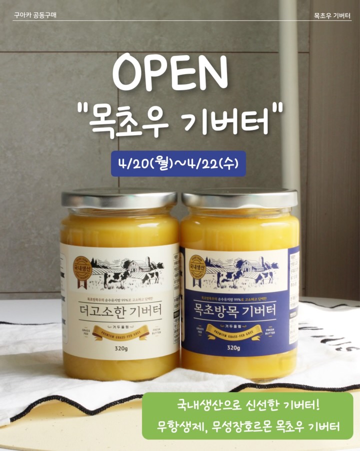 “링크” 적어주시면 목초우 자연방목 국내생산 기버터 핫딜링크 보내두려요! [목초우 자연방목 기버터 버터 최저가 공동구매 📌오늘 오전 10시오픈 🎁알림 추첨 이벤트 - 목초우 자연방목 기버터 320g 1병 (3명) 참여방법: 팔로우 하고 알림 적어주세요. -네이버페이 1만원권 (3명) 참여방법: 구매 후 구매완료+전화번호 뒷자리 적어주세요! 안녕하세요. 구아카입니다.😍 오늘 오전 10시에 목초우 기버터 공동구매 오픈해요! 일반 버터는 고온에서 바로 타서 생으로 먹거나 빵에 발라먹고 저온요리에 사용하거나 요리 맨 마지막에 넣어서 사용하는게 좋아요! 기버터는 고온요리시 적합한데 발연점 250도라서 정말 편하게 써요! 그리고 고소하고 신선함이 확 느껴져요! 또 이번 기버터는 국내생산으로 최근에 만든 기버터 보내드리니 수입산이라는 맛과 향 풍미가 다를거에요! 또 13,900원으로 가격도 착한 기버터 써보고 싶다면 알림 남겨주세요❤️ ✅목초우 자연방복 기버터(월요일부터 구매가능) -뉴질랜두 목초우 자연방목한 기버터🐮 -무항생제, 무성장호르몬으로 동물복지 원유 -국내에서 바로 만든 기버터로 보내드려요. -신선함과 고소함이 차원이 달라요! -발연점 250도로 요리에 사용하면 풍미가득해요! -유당, 카제인이 없어 배 안아파서 속이 편해요 -오메가3 & 오메가 6, 지용성 비타민 A, E, K 풍부! -방부제, 착색제, 향료 ❌ 무첨가한 기버터 📆공동구매 날짜 : 4/20일(월) ~ 4월 22일(수) 📦상품리스트 및 가격 1)오리지널2병+더고소한2병 →58,100원 2)오리지널 기버터 320g 4병 →55,600원 3)더 고소한 기버터 320g 4병 →60,900원 4)오리지널 기버터 320g 1병 →13,900원 5)더 고소한 기버터 320g 1병 →15,399원 📌제조년월은 그 주에 만든 신선한거 보내드려요. -개봉전 18개월 / 개봉 후 상온 3개월 / 개봉 후 냉장 18개월 이에요! 📌 물기 없는 수저를 사용해주세요. 🛒구매방법: 프로필 상단의 링크를 클릭 후 사진 클릭하면 구매페이지로 이동! #버터 #기버터 #버터추천 #꿀템 #살림템