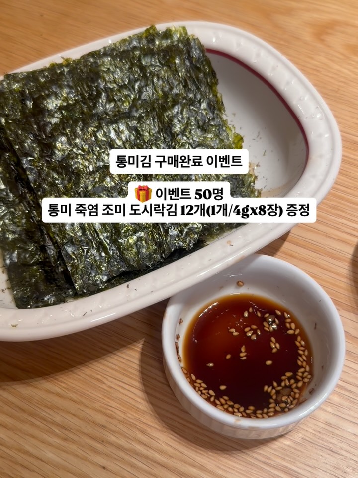통미 죽염 조미 도시락김 12개를 증정하는 구매완료 이벤트입니다. 여름에 공구 진행이 어려우니 이번 기회를 놓치지 마세요.