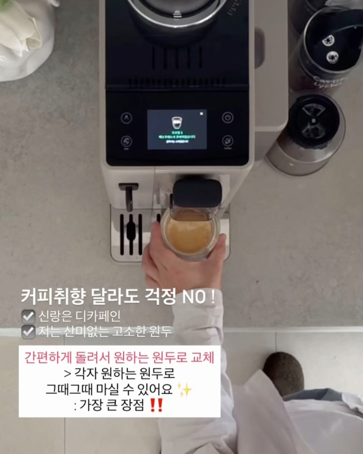 압도적인 스펙의 #리벨리아 저는 어떤 제품이든 아무리 좋아도 손이 자주 안가면.. 아무 의미없다고 생각해요 집 한구석에 모셔놓기만하고.. 디스플레이 용도로 쓰기엔 ㅠㅠ 돈 아깝잖아요 🥹 무조건 쓰기 편해서 ✅ 손 자주가는거 ! 그게 뽕뽑는건데 세계 1위 🥇 드롱기 #리벨리아는 ▪️조작 간편하고 ▪️관리 편해서 (세척) 어린아이들 / 어르신분들도 쉽게 할 수 있는 제품이예요 7살 막둥이가 커피내려줄 정도면.. 말 다했죠? ㅎㅎ 리벨리아의 가장 큰! 장점인 ✅ 빈스위치 ( 원두컨테이너가 2개) 기능은 드롱기 커피머신 최초 ‼️입니다 : 취향에 맞게 그때그때 바꿔가며 먹을 수 있어요 ( 보통은 한번 담은 원두를 다 소진할때까지 다른 원두 사용을 못합니다. 즉 입맛따라/ 취향따라 원두바꾸기가 되게 번거롭다는거 ) • 아침엔 다크한 원두 / 저녁엔 디카페인 • 신랑은 산미 있는거 / 저는 산미 없는거 이런식으로 바꿔가며 쓸 수 있어요 ✔️ 사용해보시면 진-짜 유용하다고 느끼실 포인트⭐️ - 게다가 ✅ 빈어댑터 기능은 원두마다 특징에 맞는 최적의 온도/ 그라인딩 값을 찾아줍니다 저장해놓고 쓰면 그 원두로 먹을 수 있는 가장 맛있는 세팅값으로 만들어줘요 ♥️ ( 우린 바리스타 아니니까... 똑같은 원두로 만들어도 내가 할때 / 남이 할때 맛다른 반자동은 패스하는걸루...) 장점이 너-무 많은 제품이라 앞으로 차근히 더 설명드려볼께요 :) 백화점에서 180-190에 판매하는 동일모델로 꼭! 가격/혜택 비교 다 해보셔요 #한정수량으로 진행중입니다