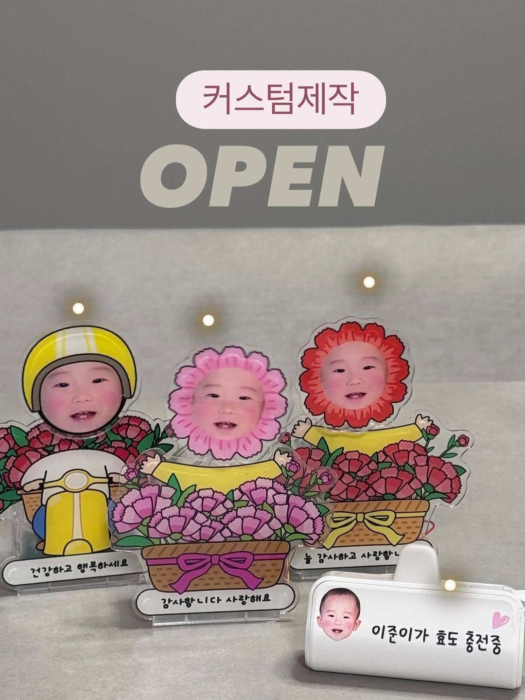 커스텀 제작템 공구오픈💜 [링크]남겨주시면 할인링크 디엠발송💌 ✅흔들흔들 등신대 귀여운 손주 얼굴 담긴 흔들흔들 등신대 디자인도 다양하고, 커스텀제작이라 더 의미있어요♥️ 디자인/문구 선택가능✨ 태양열에너지로 흔들흔들〰️ 365일 건전지 걱정없어요 ✅커스텀 보조배터리🔋 이거 필요없는 사람있나요⁉️😳 장시간 외출이나 여행하다보면 배터리 걱정때문에 보조배터리는 꼭챙기는데 그냥 배터리아니고 커스텀 제작한 배터리💕 내사랑 최애가 언제 어디서나 충전해주는데 5000mAh 실용적인 용량에 8핀 /c타입 동시 충전가능하고 거치대 기능까지!! 힘나는 문구, 디자인도 커스텀 가능해요🌼 기내반입도 가능하니까 여행갈때 꼭챙기세요✈️ #어버이날 #어버이날선물 #카네이션 #효도템 #육아템