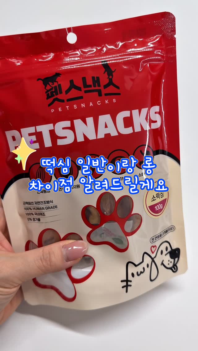 떡심 종류가 롱 100g 일반 100g 두가지가 있어요 일반은 지퍼백에 작은 고구마말랭이처럼 들어있는거고, 롱은 왕큰사이즈 떡심이 2개 들어있어요 대형견 친구들은 오래 씹는 롱 떡심 좋아하시고, 간식 조금씩 주고싶은 보호자님들은 일반100g 선택해주시면 됩니다! 허파랑 간은 수량 정말 소량 남아서 곧 품절될 거 같아요 같이 주문 넣어주세요❤️