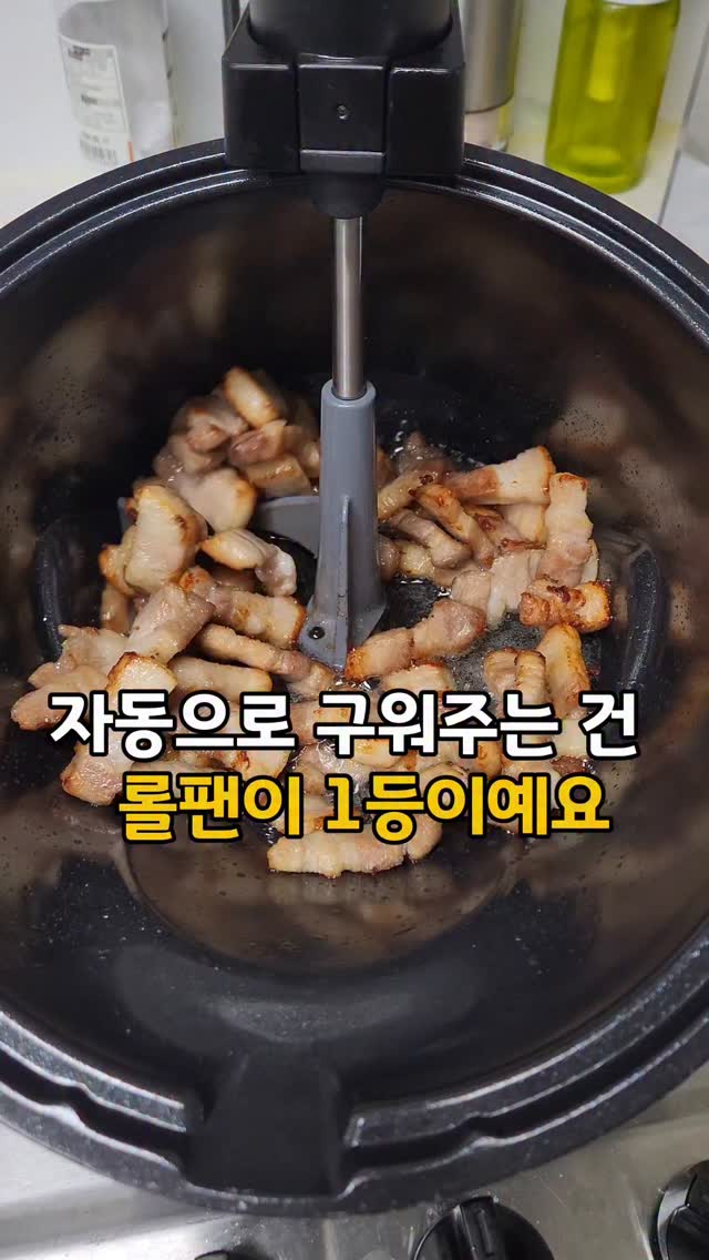 자동으로 볶고 저어주는 롤팬으로, 고기를 구울 때 눌러붙지 않고 고르게 익힙니다. 볶음밥도 쉽게 만들 수 있어 요리의 편리함을 제공합니다.