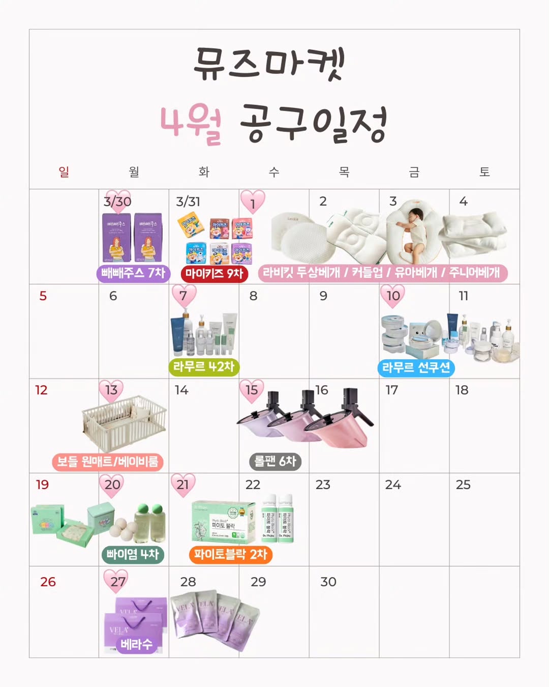 뮤즈마켓 4월 공구일정 🔔알림 신청은 댓글로 “제품명 + 알림신청” 남겨주세요! 오픈 후 최저가링크 보내드릴께요💗 ✅️4월 1주 ▶️3.30~4.2|빼빼주스 7차 ✔독소배출 끝판왕 디톡스 빼빼주스 ✔스틱 한포에 황금배합 6가지 주원료 🎁5박스이상/10박스이상 구매시 커피쿠폰 ▶️4.1~4.5|라비킷 베개 4종 ✔두상베개 / 커들업 / 유아베개 / 주니어베개 ✔육아맘들 사이에서 꾸준히 선택받는 라비킷 🎁소문내기이벤트 - 두상베개 5명 추첨 🎁구매완료이벤트1 - 블랭킷 10명 추첨 🎁구매완료이벤트2 - 구매인증 시 커피쿠폰증정 ▶️4.1~4.15|마이키즈 8차 (매 달 1일 정기공구) ✔한 팩에 성장 발달 필요영양소 함량 ✔엄마들의 걱정을 줄인 당함량과 유당불검출 🎁3박스이상 구매시 커피쿠폰 🎁1000원 추가할인쿠폰 ✅️4월 2주 ▶️4.7~4.9|라무르 42차 공구 ✔N년째 사용중인 꿀피부 유지템 ✔건조필수템 - 시카밤, 앰플, 크림, 호호바오일 추천! 🎁구매완료이벤트 - 시카스팟 3명 ▶️4.10~4.14|라무르 선쿠션공구 ✔라무르 선쿠션 3+1 이벤트 ✔라무르 20종 구매 가능 🎁구매완료이벤트 - 선쿠션 3명 ✅️4월 3주 ▶️4.13~4.17|보들 원매트&베이비룸 ✔아기있는집 필수템 ✔우리 아이 안전 공간 ▶️4.15~4.30|롤팬 6차 ✔봄 한정 색상 출시 ✔삼겹살, 볶음밥, 짜장&카레, 팝콘 등 다양한 요리 가능 ✔식기세척기 사용가능 🎁롤팬 구입 시 전용가방 증정 ✅4월 4주 ▶️4.20~4.22| 빠이염 4차 ✔ 비스코스100% 국내생산 ✔ 미세먼지 흡착 / 형광증백제 흡착 ✔ 이염성적서 업계 1등 ▶️4.21~4.26|파이토블락 2차 ✔100% 국산 삼백초 추출물 ✔우리 가족 호흡기 관리 필수템 🎁6박스이상 구매시 커피쿠폰 ✅4월 5주 ▶️4.27~4.30|베라수 ✔독소배출 끝판왕 디톡스 빼빼주스 ✔스틱 한포에 황금배합 6가지 주원료 🎁5박스이상/10박스이상 구매시 커피쿠폰 🔔 알림 신청은 댓글로 “제품명 + 알림신청” 남겨주세요!