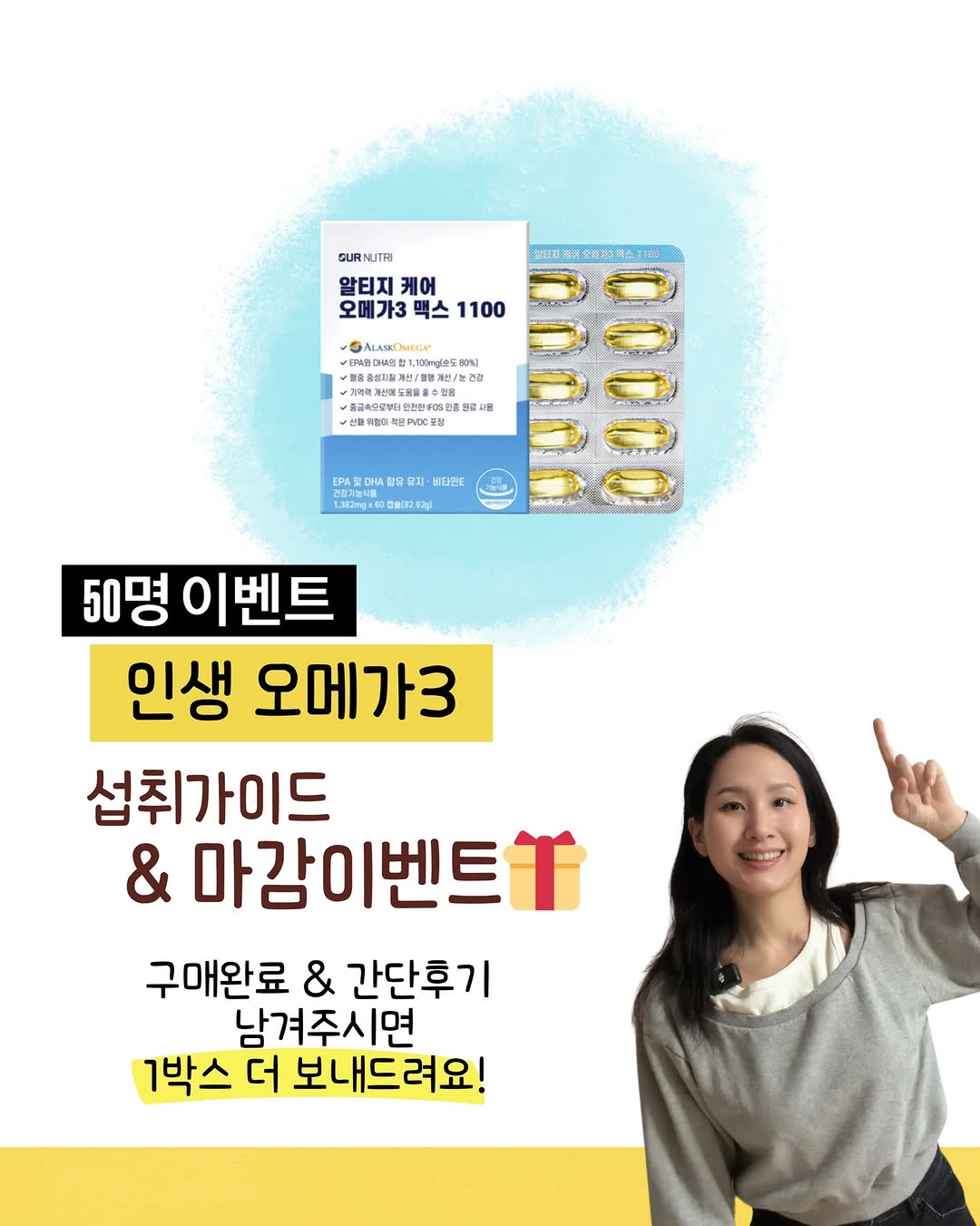 #마감이벤트 #후기이벤트 🐟인생오메가라 해주시는 아워뉴트리 맥스 주말마감합니다! ⏰아직 구매 못하신 분들 서둘러주세요!! 한달분 최대 13000원대, 심지어 엄격한 품질관리로 어취가 극도로 억제되어 그동안 비린내 걱정되셨다면 정착해보세요 AlaskOmega 정상급 원료에 용량은 1,100mg 짜리이면서 이정도 가격대 있으면 제보 좀 해주십셩ㅎㅎ 자신있게 소개해드리고있는! 저의 오래된 애정하는 오메가입니다 🫒일상에서 좋은기름 추가해 드시라고 랜덤 30분께 올리브오일 🎁이벤트는 본품이 최고죠? 랜덤 20분께는 1박스 본품 이렇게 총 50분 이벤트갑니다!!! 댓글에 구매완료 + 아무후기 남겨주세요