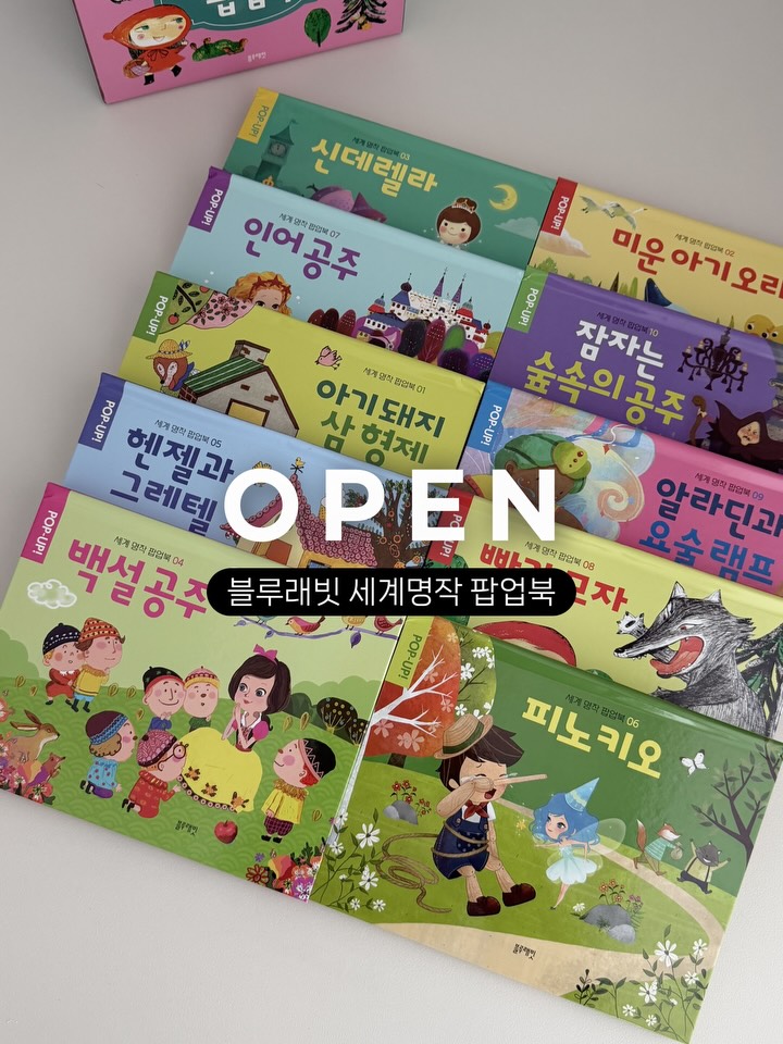 블루래빗 명작 팝업북은 세계 명작 10권으로 구성된 팝업북으로, 아기들이 감정을 느끼고 표현력을 키우는 데 도움을 줍니다. 한 권당 2천원대의 가격으로 갓성비를 자랑합니다.