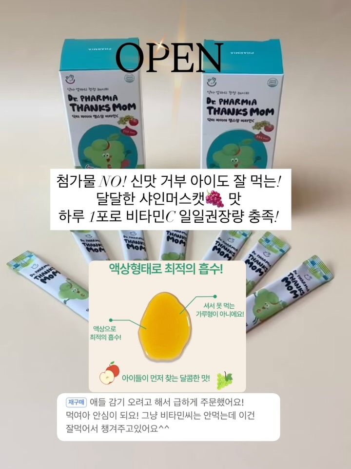 댓글 ‘링크’ 남겨주시면 최저가 링크 디엠으로 보내드릴게요😊 (팔로우 되어 있어야 디엠이 정상적으로 발송 되어요) 📌공구일정 4.1(수) 오전 11시부터~4.3(금) 자정까지 🚀 오후 1시 이전 주문 건 당일 출고 📱 문의: 닥터파미아 네이버톡톡 🎁이벤트🎁✨ 첫번째.후기 이벤트! 파미아 비타민C 드셨던 분들😍 솔직한 후기 남겨주시면 정성 후기 5분께 네이버 포인트 적립 5,000원 드려요:) 제 공동구매 아니어도 참여 가능! 부담 없이 남겨주세요❤️ 두번째.구매완료 이벤트✨ 구매완료 + 휴대폰 뒤 4자리 남겨주시면 추첨 통해 5분께 네이버페이 5,000원 지급! 📌라인업! 파미아 비타민C 파미아 배도라지 맥문동즙 (1+1 이벤트) 파미아 수세미 작두콩 즙 ㅡㅡㅡㅡㅡㅡㅡ 따뜻한 바람이 불어오고, 옷차림도 한결 가벼워진 봄 🌸 살랑이는 공기에 괜히 기분까지 좋아지는 요즘이에요. 야외활동도 많아지구요 하지만 아침, 저녁으로는 아직 쌀쌀한 날씨. 환절기의 갑작스러운 기온 변화는 아이들의 면역력을 떨어뜨려 ‘감기’에 더 쉽게 걸리게 해요 그래서 면역력을 높여주는 것이 중요..!! 면역력의 밑바탕이 되고, 우리 몸을 지키는 ‘기초 방어력’인 비타민C 또 감기는 대부분 바이러스인데 비타민C는 이런 바이러스를 억제하거나 공격을 줄이는 역할을 하기때문에 감기 증상 초기에 비타민C 꼭 더 챙겨주세요! 📍혹시 요즘 아이가 이런가요? 감기 자주 걸려 소아과 예약 전쟁 기분 변화가 잦고 예민함 편식, 입맛 저하 건조하고 거칠어진 피부 수면 패턴 불안정 👆 이 모든 게 사실 비타민C 부족 신호일 수 있어요. 💡 비타민C는 면역 시스템이 제대로 작동하도록 도와주고 모든 성장 과정에 꼭 필요한 기초 영양소예요! ✔️ 감기 예방 ✔️ 피부 및 뼈 건강 ✔️ 철분 흡수 ✔️ 스트레스와 감정 조절 ✔️ 면역력 밸런스까지 🏅 실제로 노벨상을 2번 받은 라이너스 폴링 박사도 👉 “비타민C만큼 감기 예방에 효과적인 건 없다”고 했어요✨ 이렇게 꼭 챙겨먹어야 하는 비타민 C! 유해성분 없는 제품만 고르고 고르는 제가 비타민 C 고른 기준은 딱 이거였어요👇 ✔️ 당도 미공개는 패스 ✔️ 첨가물이 있는지? ✔️ 아이가 잘 먹는지? 🛡 그래서 최종 선택한 제품은? 닥터파미아 비타민C 🍋 ✅ non-GMO, 인공첨가물❌ 방부제 ❌ 향료 ❌ ✅ 1.6g 저당도(기존 2.4g에서 리뉴얼 후 1.6g 으로 당류를 더 줄였어요!) ✅ 세계적인 비타민 전문기업 영국 DSM사 비타민C 원료 ✅ 100% 유기농 사과 + 100% 국내산 샤인머스캣 으로 맛까지 착하게 ✅ 하루 1포(비타민C 100mg)만으로 비타민C 하루 권장량 100% 충족! ✅ 면역부스터인 ‘아연’까지 함께 들어있어 자연 방어력 UP↑ ✅ 부원료로 들어간 인디안 구스베리 (‘신의 열매’라고 불리는 비타민C의 보고) ✅ 약사 엄마가 딸을 위해 직접 만든 아이용 비타민 C ✅ 개별 포장이라 외출 시도 간편해요 무엇보다 신맛 잡은 샤인머스켓 맛으로 너무 잘 먹고 더 달라고 하는 마성의 비타민C 인데! 성분도 좋아 안심하고 먹일 수 있어요 정말 이건 공구하려고 찾은 제품이 아니라 제가 평소에 저희 아이 챙겨 먹여온 제품인데 좋은가격에 소개시켜드릴 수 있어 너무 기뻐요🥹 공구가가 진짜 너무 좋아서 저도 매번 공구때마다 왕창 쟁여놓고있;;😍👍🏻 중요한 건 아프기 전에 면역력을 잘 관리해주는 것! 바로 이게, 우리 아이가 스스로 이겨낼 힘을 만드는 방법이에요💪🏻 궁금하신 점 있으시면 약사인 대표님 계시니 편히 문의주세요💌 @loveu_bokja 대표님께 직접 dm 주셔도 되고 저에게 주셔도 돼요 👉 @나짱구 팔로우하고 육아 꿀팁&꿀템 놓치지 마세요🤗 좋아요/저장/공유는 컨텐츠 제작에 큰 힘이 됩니다😄 . . #아기비타민C #어린이비타민 #비타민씨 #육아템 #육아정보