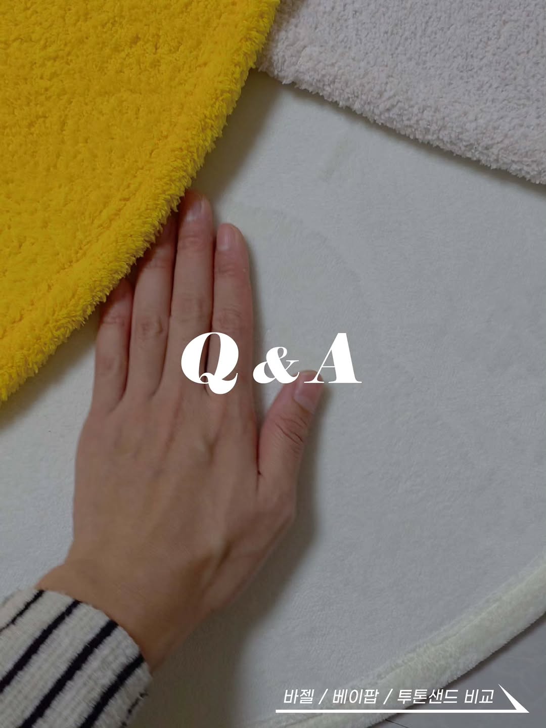 러그 종류가 많아 헷갈리시죠?😵💫 Q&A 모아 정리 해 봤어요! 〰️〰️〰️〰️〰️ ⁉️바젤 / 베이팝 / 투톤샌드 소재? 포근하고 부드러운건 전부 동일 전부 확실한 단모라 타사 제품보다 오염관리 월등히 높아요! [바젤] 밀도감 ★★★★★ 부드러움 ★★★★★ 바닥 밀착력 ★★★ [베이팝] 밀도감 ★★★ 부드러움 ★★★★★ 바닥 밀착력 ★★★★★ [투톤샌드] 밀도감 ★★★★ 부드러움 ★★★★★ 바닥 밀착력 ★★★★★ ⁉️'바젤' 사용시 미끄럽지 않나요? 수면양말, 일반양말, 맨발에도 전부 미끄러짐 없었고 아이들이 뛰어다녀도 멀쩡했어요! ⁉️두께는 어느정도 인가요? 바젤 / 베이팝 / 투톤샌드 전부 테두리 기준 1cm 두께로 타사 제품보다 월등히 도톰해요 ⁉️맨발로 밟는 촉감 차이? 셋 다 도톰해서 푹신한건 동일하지만 [바젤] 촘촘한 기모가 피부에 닿는 느낌 [베이팝 / 투톤샌드] 부드러운 양털이 피부에 닿는 느낌 ⁉️바닥에 밀착은 잘 되나요? 바닥 밀착력은 바젤 보다 베이팝 / 투톤샌드가 더 좋아요! 로봇청소기 쓰신다면 베이팝 / 투톤샌드 추천! ⁉️확실하게 포인트 되는 러그는? 여기 저기 포인트 주기 좋은건 색상 다양한 베이팝 강력추천! ⁉️200*300 세탁 시 탈수 되나요? 24kg 세탁기 기준, 탈수 안됐어요! 200*300은 30kg 이상 세탁기 권장합니다🫡 ⁉️모델별 청소 난이도 비교 [바젤] 손줍줍 ★/돌돌이 ★/청소기 ★ [베이팝] 손줍줍 ★★/돌돌이 ★/청소기 ★ [투톤샌드] 손줍줍 ★/돌돌이 ★/청소기 ★ ⁉️방수력 차이 비교 바젤은 방수력이 뛰어나고 베이팝 / 투톤샌드는 흡수력이 뛰어나요! ⁉️오염 시 제거 난이도 비교 [바젤]★ 물티슈 만으로 제거가 거의 가능하고 가벼운 초콜릿 얼룩은 쉽게 지워짐 [베이팝 / 투톤샌드] ★★ 물티슈 만으로 제거하기는 어렵지만 기계 세탁 후 웬만한 얼룩들 완벽히 제거됨 ⁉️기계 세탁 가능? 손상 없나요? 모든 러그는 기계 세탁 가능하고 찬물 세탁에도 러그 손상 없이 완벽하게 오염제거 됩니다! ⁉️각 모델별 적용 예시는 영상으로 확인 해 주세요! 〰️〰️〰️〰️〰️ 📍후기 평점만 4.8 이상 인기템 모두 모아 공구 진행 합니다🎉 📍공구 모델 바젤 (러그,주방매트) 베이팝 (러그, 주방매트) 투톤샌드 (러그) 📍사이즈 구성 - 러그 S (100*150) M (160*240) L (200*300) ---------- - 주방매트 50*120 50*150 〰️〰️〰️〰️〰️ 🎁이벤트 있어요! ★구매고객 증정 M사이즈 이상 구매고객 전원 (베이팝 워셔블 도어매트 40*60 타원형) 증정! ★구매인증(5명 추첨) 구매 후 '오픈피드'에 '성함+연락처 뒤4자리' 남겨주시면 (베이팝 워셔블 50*120 롱구름) 증정! ※사은품 색상은 랜덤 입니다! 〰️〰️〰️〰️〰️ 📍공구일정 4월8일(오전10:00) ~ 4월12일 📍댓글에 ❤️ 남겨 주시면 빠르게 링크 보내드려요📨 #헤이베이 #인생러그 #멋쓰랩 #공구중