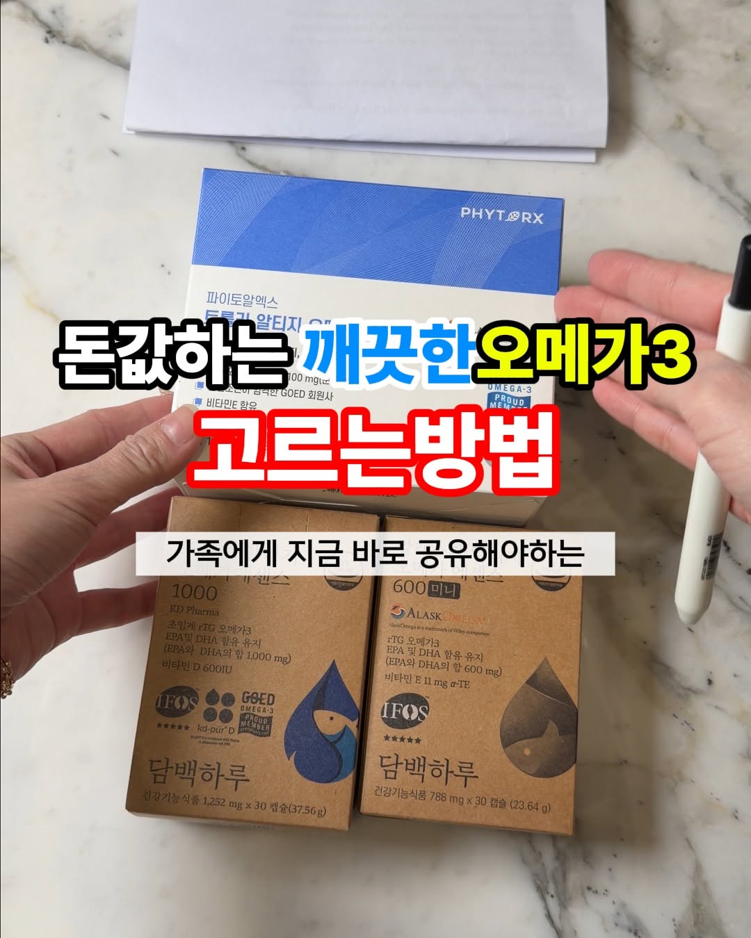 ✅ 돈값하는 깨끗한 오메가3 고르는법 🔔 지금 바로 오메가3 먹는 가족과 지인에게도 이 영상을 [ 공유 ] 해주세요 #공동구매 중인 담백하루 KD파마오메가3 를 예로 설명드렸습니다 1. 원료사 가장 중요합니다⭐️⭐️⭐️⭐️⭐️ 검증된 원료사 예시 : KD파마/알래스카/폴라리스/지씨리버/DSM 등 2. 함량 EPA+DHA 합 기준 1,000mg 내외 (900mg~1,100mg) 3. 순도⭐️⭐️⭐️ : 순도, 굉장히 중요합니다. 직접 표기가 의무가 아니기에 눈속임 업체 너무많아요.😡 순도가 낮다면 EPA+DHA 외의 다른 성분이 많은것입니다 같은 원료사라도 순도가 낮을수록 퀄리티가 떨어지게됩니다 순도는 직접 계산하셔야하는데요 최소 70% 이상인 제품이 먹을만 합니다 [ 순도계산공식 ] = EPA+DHA 한알당 함량 / 한알 중량 x 100 ex) 1,000mg/1,252mg x 100 = 79.9(%) 4. 인증마크 (iFOS, GOED등) 완제품 iFOS 5-star인증이면 베스트입니다 원료만 ifos 5-스타여도 믿을만한데 다 만들어진 제품을 별도로 돈을 크게 들여 검사를 맡긴다는건 그만큼 품질에 자신있다는 뜻이죠 5. 포장방식 가급적 개별포장으로 빛 산소 잘 차단한것이 best 6. 냄새, 맛 썩은 악취가 난다면 바로 폐기해주세요 생선기름이다보니(식물성을 제외하면) 고등어, 꽁치 같은 생선맛이 나는건 자연스럽고 부패한 썩은생선맛이 난다면 바로 탈락입니다 (✅집에 있는 오메가3 바로 테스트해보세요) 7.가격 품질관리가 잘 되고 합격했다면 한달치 가격대가 1.5만원~2만원 이하로 되는지 체크해주세요 오메가3는 꾸준히 평생 드실 수 있는 영양소라 무엇보다도 품질관리, 합리적 금액대가 중요합니다 (특히 메가도즈하시는 분들은 더욱이 중요하겠죠) 궁금하신 점 댓글문의주세요 ^^ 양질의 오메가3 찾기에 도움되시길 바랍니다 감사드려용! ✅ 오메가3 드시는 지인분께 바로 [공유] 해서 체크해주세요