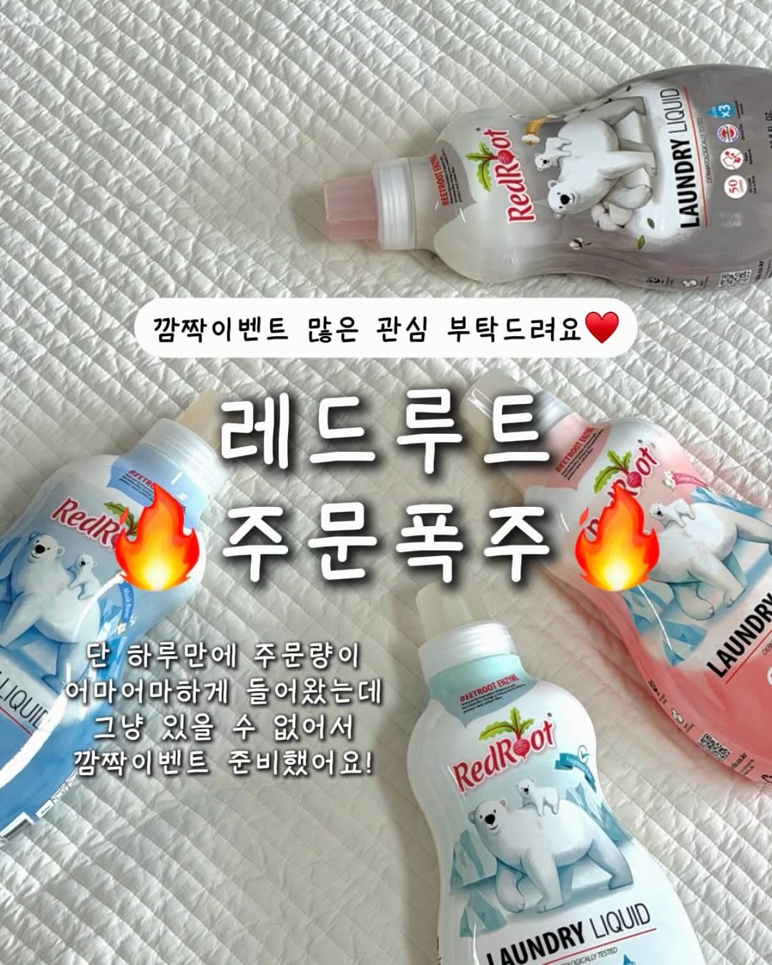 레트루드 🔥주문폭주🔥 깜짝이벤트! 단 하루만에 주문폭주! 주문량이 어마어마해요🥹 감사한 마음 담아 깜짝 이벤트 준비했어요! 🙋🏻♀️ 댓글로 여러분의 원픽 향이나, 사용하셨던 찐후기, 또는 기대평을 남겨주세요! 추첨을 통해 3분께 [레드루트 주방세제]를 보내드릴게요♥️ (많관부! 여러분의 원픽이 너무 궁금해요) ➡️ 공구마감 이후 스토리를 통해 당첨자 발표할게요! ——————————————— ⭐️ 실시간 인기 순위 TOP 4 결정하기 힘드신 분들은 이 순위를 참고해주세요! 역시 세트 구성이 압도적이에요🔥 1️⃣ 세탁세제 3개 + 유연제 3개 (가장 많이 쟁이시는 구성!) 2️⃣ 건조기시트 3개 (유연제랑 같이 쓰면 향기 대폭발!) 3️⃣ 세탁세제 3개 or 유연제 3개 (단품 집중 공략!) 4️⃣ 캡슐세제 2개 (간편함 끝판왕!) 🌸 또훈맘의 향 가이드 성분은 기본(맘가이드 A등급), 향기는 취향껏 골라담아가세요! ▪️바닐라코튼 (또훈맘 원픽) : 부드럽고 포근한 코튼향 가장 많은 분이 추천하고 정착하는 향! ▪️스위트플로랄 : 달콤하고 상큼함이 팡팡 터지는 기분 좋은 향 ▪️머스크플로랄 : 은은하고 고급스러운 꽃향기를 원하신다면 추천 ▪️무향 : 신생아부터 6개월까지는 무향을 가장 추천드려요! ——————————————— 💰초특가 혜택, 놓치면 후회해요! 인기 1순위 [세탁세제 3개 + 유연제 3개]세트 구성을 인터넷 최저가랑 비교해보면 약 2만 원 차이! 공구가 58,900원은 진짜 놓치면 후회할 가격이에요✨ 소비기한 넉넉하게 챙겨왔으니 이번 핫딜 때 꼭 쟁여두세욧! 다음에 또 공구로 가져올 수 있을지 미정이에요😭 ——————————————— 100% 식물유래 세정성분 / EWG 그린등급 / 더마테스트 완료! 전성분 공개할 만큼 자신 있는 레드루트인거 아시죠? 우리 아이 피부에 직접 닿는 옷, 아무거나 쓸 수 없잖아요🚨 세정력도 좋아 온가족 세제로 최고에욧! 세제뿐만 아니라, 섬유유연제 / 젖병세제 / 주병세제 / 얼룩제거제 / 산소표백제 / 건조기시트까지 알차게 준비했으니 쏙쏙 골라담아가세요🧺