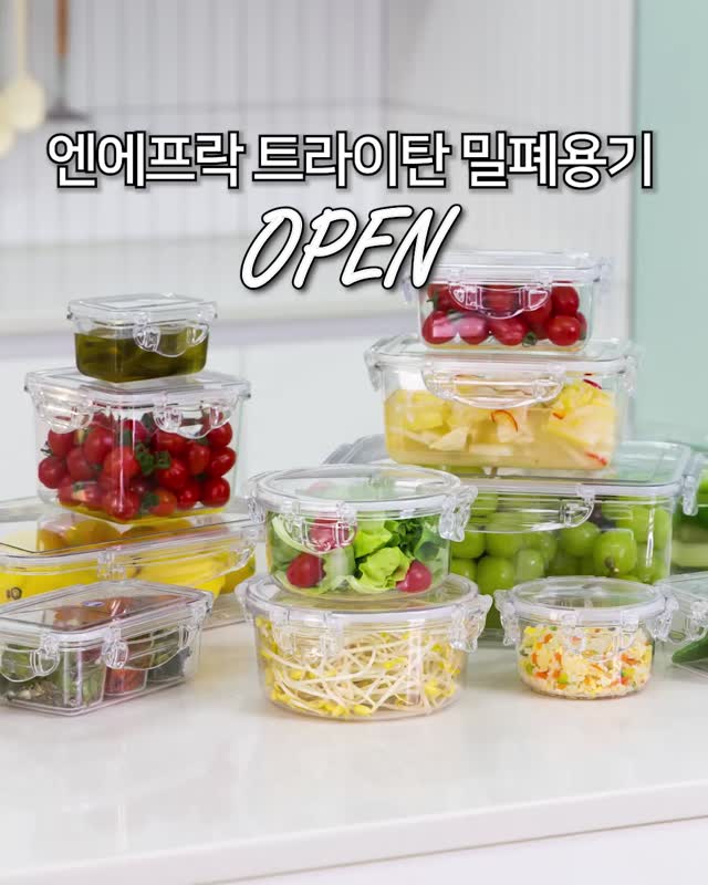 투명한 트라이탄 밀폐용기로, 안전하고 가벼우며 색배임과 냄새 걱정이 없습니다. 다양한 종류가 있으며 세트 구매가 경제적입니다.