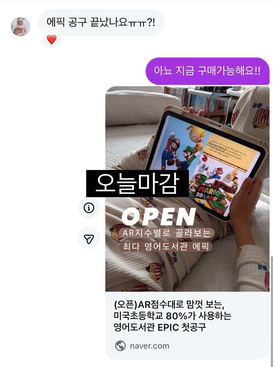 ☺︎ 🔚에픽은 오늘마감🔚 댓글로 에픽 달아주시면 바로구매 링크 전송해드려요✔️ AR2점대에는 영어책을 많이 읽어야 그야말로 다독만이 점수를 돌리는길인데요!! 엄마속셈을 숨기고’◡‘ 재밌게 노출해주기 딱좋은게 에픽예요!! 유누는 7살쯤 북스 쭉 보다가 작년겨울부터 에픽을 보기시작했는데요 더 일찍 노출해주고싶었지만 영어기초 1도없이 괜히 흥미만 잃을까바 타이밍을 기다렸거든요 딱 지금이 적기✔️ 하교하고오면 에픽 3편을 재밌고 보고난후 하고싶은놀이를 하는게 우리집 규칙이거든요 매일듣기와 쉬운책읽기를 동시에 충족할수있어요🤗 미국 초등학교 80%이상이 실제로 사용하고있고 40,000여권의 도서를 보유하고있는 영어도서관 캣닌자와 같은 그래픽노블부터 내셔널지오그래픽 같은 넌픽션, 까이유 몬스터 등 정말 재밌는 보물같은 책들이 팔수록 계속 나와요💛 집에서 이정도 도서를 사서 노출해주기는 사실 여건상 힘들죠ㅠㅠ 에픽 해주세요!! ▪️구매하신 모든분들께 일프로연산 1개월권을 증정 ▪️구매하신 모든분들께 Vooks 1개월권을 증정 ▪️구매완료 댓글을 달아주시면 10명 추첨 커피쿠폰 증정☕️ ▪️구매하시고 구매완료 댓글을 달아주시면 AR지수별 도서리스트를 메일 발송(공구 끝나고 1주일뒤 일괄발송예정) 에픽은 자정마감할께요🙋🏻♀️ #영어도서관 #초등영어