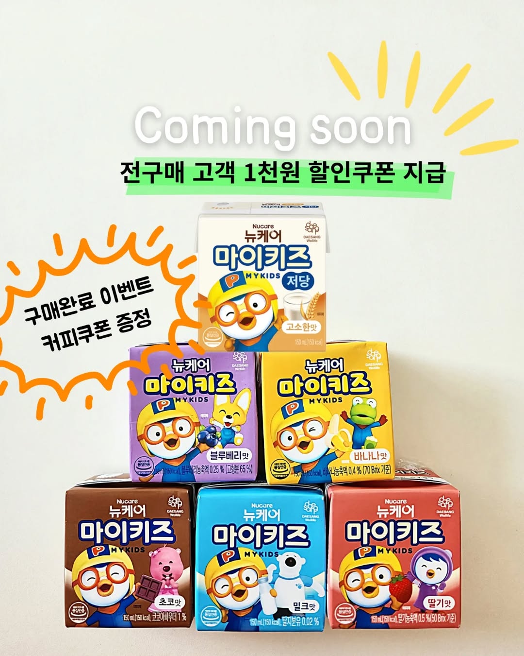 아이들 영양밸런스를 위해 가장 추천하는 건강한 간식 마이키즈! 🔜 4월 24일 📢건이맘 이벤트 ▪️마이키즈 다량 구매시 추가 할인 ▪️1,000원 추가 할인 쿠폰 (회원가입 후 구매시) ▪️구매완료 이벤트(댓글 추첨) - 스벅쿠폰 증정 우리 아이들 밥 잘 안먹고 편식하면 너무 신경쓰이고잘먹는 거라도 더 챙겨주고 싶자나요‼️ 부족한 영양소때문에 걱정 되구요‼️ 🥛한 팩 150kca로 우리아이 든든하게 챙겨주세요 🥛총 -가지맛‼️ 밀크/초코/딸기/블루베리/바나나/저당 고소한 맛 🏷 24일(금)오픈 할께요 🏷알림 댓글 남겨주시면 오픈하자마자 제일 먼저 소식 전해드려요