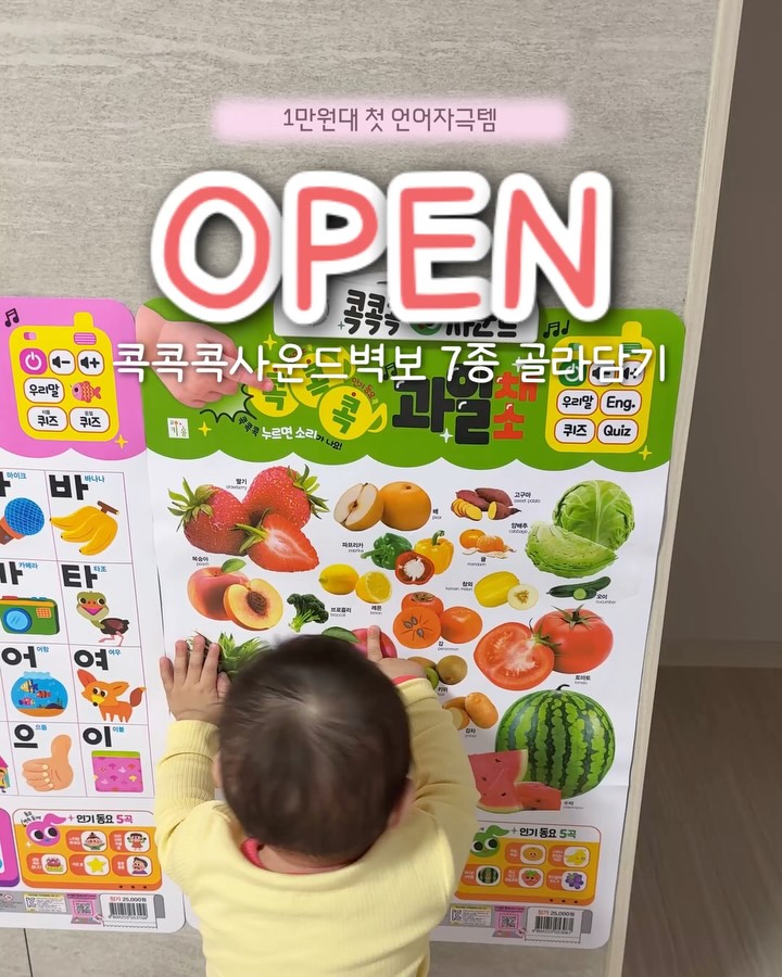 🔔 콕콕콕 사운드 벽보 7종 & 쑥쑥이차트 오픈 펜 없이, 손으로 톡! 누르기만 하면 바로 소리가 나요 🔊 ✔ 우리말 / 영어 / 퀴즈 기능 ✔ 동요 & 악기 모드 ✔ 그림·글자 어디를 눌러도 즉각 반응 ✔ 혼자서도 즐기는 놀이학습 숫자, 한글, 영어, 과일, 동물, 탈것, 악기 총 7가지 벽보 구성으로 놀이처럼 자연스럽게 익혀요! 📌 쑥쑥이차트는 벽보를 쏙 넣어 보관하고 걸어둘 수 있는 거치형 차트! 구김·찢김 걱정 줄이고 깔끔하게 정리까지 가능해요 🙌🏻 ✔ 큐방 & 매직후크 동봉 ✔ 벽면/문에 간편 설치 가능 📆 공구기간: 3/2-3/4 👉🏻 프로필 링크에서 지금 확인해보세요!