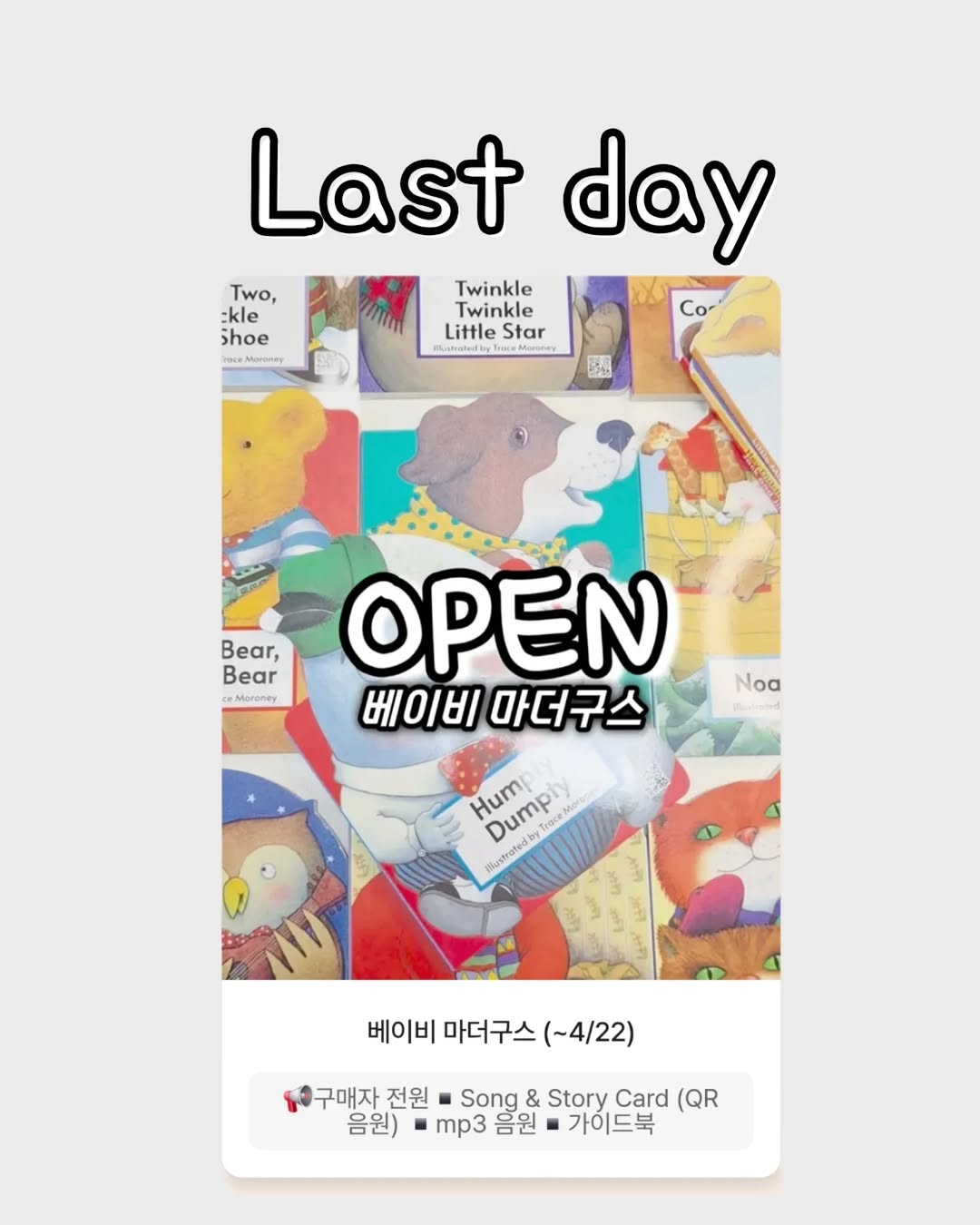오늘 베이비 마더구스 공구 마지막이에요 🤍 계속 고민만 하셨다면 오늘이 마지막 기회예요 🙏 — 이건 앉혀놓고 하는 영어라기보다 👉 그냥 틀어두는 영어 🎵 ✔ 짧고 반복되는 리듬 ✔ 듣다 보면 자연스럽게 익숙해지는 구조 — ✔ QR 찍으면 바로 재생 ✔ CD로 쭉 틀어두기 가능 ✔ Song & Story Card까지 👉 상황에 맞게 편하게 사용하실 수 있어요 — 📦 보드북 16권 + CD + 송카드 📦 MP3 / 가이드북 / 워크지 제공 — 오늘 마감 이후에는 현재 공구 조건으로는 진행 어려워요 🙏 마지막으로 확인해보세요 🤍 ❤️구매 및 상품문의는 댓글또는 디엠 부탁드려요 ♥️프로필 하단링크 클릭 바로 구매가능하세요 💌댓글로 "링크" 적으면 구매링크 디엠 전송