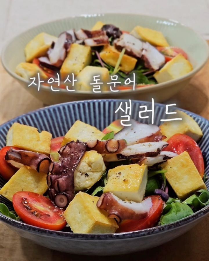 자연산 돌문어 샐러드 요즘 오전식사 어떻게들 드세요? 저는 식이를 바꾸기 전과 후 가장 큰 변화는 냉장고 속 음식들이 종류가 달라졌다는거에요~ 출출하면 꺼내 먹어야지 하고 쟁여둔 냉동실의 떡과 피자와 같은 냉동식품들이 사라지고 삶은 고구마, 깐완두콩, 손질새우, 돌문어 같은 아침 샐러드 재료들이 냉장고 속을 가득 채우고 있지요😊 지난번 간담회때 피부좋다는 얘길 들었는데😁 저랑 같이 샐러드 드셔보실래요? 돌문어를 샐러드에 곁들일 때 한팩 중 1/3 정도 사용하면 충분합니다. 프로필 링크에 올려둘게요! ──────────── ✔ 돌문어 샐러드 1. 두부를 소창행주로 물기제거하고 깍뚝썰기 해줍니다. 2. 팬에 오일둘러 두부를 바삭하게 구워줍니다. 3. 방울토마토와 모듬새싹을 그릇에 담습니다. 4. 위에 두부를 올려줍니다. 5. 자숙문어를 얇게 썰어 같이 올려줍니다. 6. 레몬즙 1T, 소금후추 1꼬집씩, 생들기름 1T를 토핑하면 완성입니다. ──────────── 국산 자연산 자숙 돌문어 [전선생레시피 X 최저가 공구] ➡ 공구일정 : 3월16일(월)~19일(목) ➡ 구매는? 프로필 상단링크 클릭! ──────────── ✔ 국내산 자연산 자숙 돌문어 ✔ 거친 파도와 물살 속에서 자란 자연산 돌문어다 보니 육질이 탄탄 탱글탱글~~ ✔ 손질 후 데쳐 급냉한 문어이기 때문에 받으시면 바로 썰어 드시면 됩니다😊 (따로 데치거나 할 필요없이 바로 드세요!) ✔ 질기지 않아서 진짜 맛있어요 ✔ 소포장이 되어 보관도 먹기도 굉장히 편해요! ──────────── #자연산돌문어 #자연산문어 #국내산문어 #국산문어 #공구