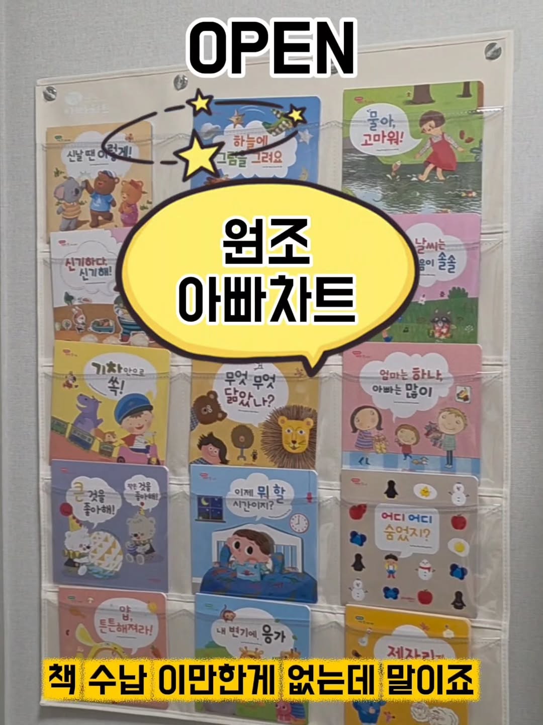 #공구오픈 🗓4월 23일 목요일 오전 10시🗓 📚책육아 필수템 아빠차트 전면 책꽂이📚 🚨링크 필요하신분들은 댓글에 '링크'적어주세요🚨 🚨오픈시, DM으로 구매링크 보내드릴게요!🚨 - 성덕이 되어 돌아온 모찌맘 ! !❤️ 첫째 신생아때 책 육아 시작하면서, 책육아카페 구경하다가 추천받아서 구매했던 아빠차트. . 좁디 좁은 집에 책장은 엄두도 안나서 책도 제대로 못 들였었거든요 ㅠㅠ 그나마 유명한 전집 조금 사고, cd몇개 사니깐 둘 곳이 없는 거에요.🥹 그래서 아빠차트 구매했었는데, 아직까지도 사용하고 있어요 ! ! 😘 튼튼함은 물론이고, 이미 저는 뽕뽑고도 남은 듯해요 . . 😎 - 아기책 쌓아만 두시나요? 열심히 책 육아하라고 책은 사는데.. 방치하고 있는 책 있으시죠? 기껏 샀는데 쌓아만 두면 매우 아깝죠ㅠㅠ 시기 지나면 당근에 헐값에 방출해야하고..😢 책이 너무 많아서 책장 여러개 들이는 것도 부담이죠. 공간차지도 그렇고..😭 - 그래서 저는 해결책을 찾았습니다! 사실.. 첫째 육아할때부터 이미 찾았던 해결책.. ✨️벽에 붙이는 책꽂이 아빠 차트 ! !✨️ 책 차트 원조는 아빠 차트인거 아실까요? 🔥무려 2009년부터 지금까지..🔥 🏆1등의 자리🏆를 놓치지않고 있는 아빠차트❤️ 원조가 원조했다! - 벽 / 창문 / 문틈 / 냉장고 / 복도 등 버리기 아까웠던 공간 벽에 아빠 차트 붙여만 주세요 !✋️ 단순한 책꽂이가 아닌 책 읽는 환경을 만들어줍니다. 책 한번 볼거 두세번 꺼내보는 매직.. 이거 찐이에요.👀 - 책 / 포스터 / 카드 / cd / 세이펜 등 제발 방치하지마시고, 아빠 차트 활용해보세요. - 국내에서 유일하게 다양한 사이즈로 왠만한 책은 수납 가능해요 !ㅎㅎ 🔥무려 40종이 넘어요..🔥 어렵게 다른 차트 검색하지마시고, 아빠 차트 하시면 됩니다.. - 📢 수납 가능한 포켓 정리한 링크 필요하신 분들은 이전 피드 참고해주시면 됩니다! - 아빠 차트 구매 시 큐방 기본 포함되어있습니다 ! 추가적으로 투명스티커, 꼭꼬핀, 베이비용 스트랩 구매가능합니다. - 📌특별 이벤트📌 👉4만원이상 구매 시 🎁어린이용 고리 수건 1개 증정🎁 👉8만원이상 구매 시 🎁어린이용 고리 수건 2개 증정 👉10만원이상 구매 시 🎁어린이용 고리 수건 3개 증정🎁 - 📌구매인증 이벤트📌 '구매완료+폰번호뒷자리' 남겨주신 분들중 총 5분께 89,000원 상당의 🎁톡스 원목골프채 선물 증정🎁 - 📌 공구일정 📌 4월 23~26일 ✔️7만원이상 무료배송 ✔️주문제작 상품으로 공구 종료 후 순차 발송 예정 ✔️제주,산간지역 추가 배송비 발생 ✔️브랜드 사정에 따라 출고일 1-3일 지연 가능성 있음 - 📌구매링크📌 프로필링크 참고