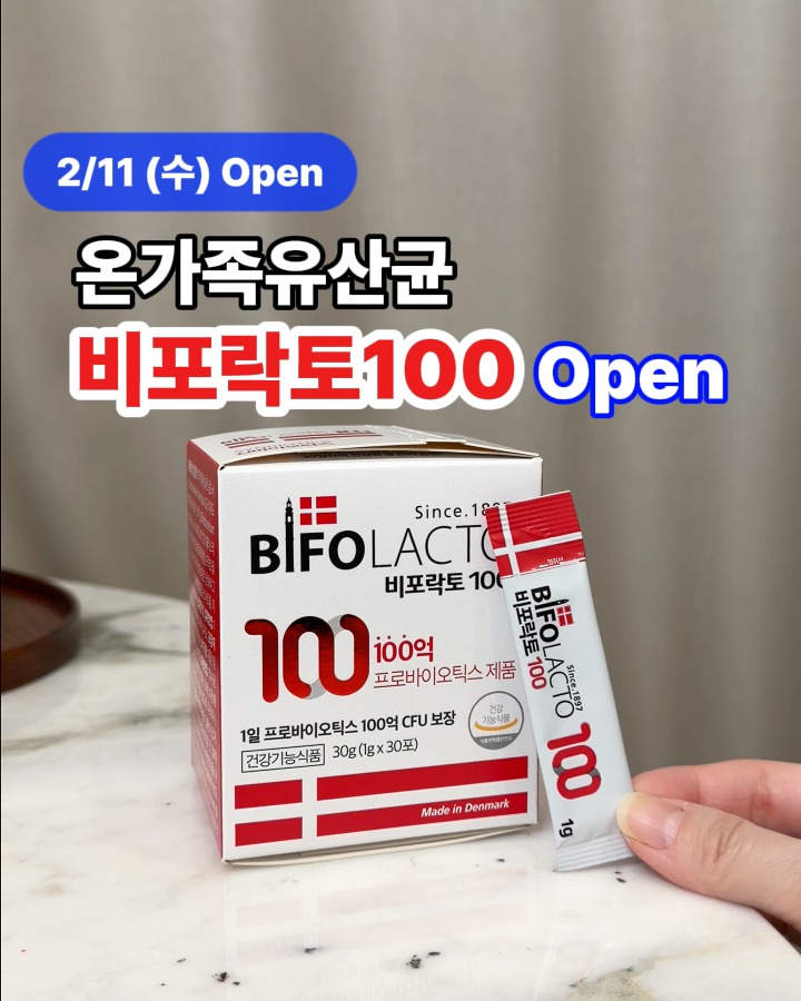 📌 < 비포락토100 > 잠시후 오전10시, 온가족 눈꽃유산균❄️ 최저가 공동구매 오픈합니다 ⠀ ▪️공동구매 Open : 2월 11일(수) 오전10시 ▪️ ▪️제품명 : 비포락토 100억 프로바이오틱스 ▪️ 🔻최대 63%할인율 온가족 유산균! 🎁최다구성 구매 이벤트 : 최다구성구매하신 분 랜덤추첨 1통씩 더 선물드리는 이벤트 총10명 (업체선정) ✅최대 63% 할인율 ▪️공구주기 4개월 ▪️소비기한 2027-07-16 ✅섭취방법 하루1포 아침 섭취(언제 드셔도 괜찮습니다) ✅섭취연령 가루를 녹여 먹을 수 있는 만1세 이상~ 📌할인혜택안내 (1박스=30포) 1️⃣4박스 192,000원➡️78,900원 (한달분 19,725원) 59% 할인율 2️⃣8BOX구성 384,000➡️146,500원 (한달분 18,313원) 62% 할인율 3️⃣12박스 576,000원➡️215,800원 (한달분 17,983원) 63% 할인율 < 비포락토100 > 눈꽃유산균 특징 ➡️ 1포에 100억 유산균 보장 ➡️ 프리미엄 균주단 2종류만을 함유 ✅ LGG균주 ✅ BIFOLAC12균주 ➡️ 이지멜트(EASY-MELT) 유산균! ➡️ 맛과 균주 구성이 대단히 좋아 온가족이 함께할 수 있어요🫐 ➡️ 덴마크 현지 연구개발, 완제품 📌 비포락토100 애용하시는 분이 정말 많으시죠 유산균은 늘 말씀드리듯이 검증된 균주, 보장된 균수가 핵심인데요 비포락토100, 눈꽃유산균은요❄️ 검증된 2종의 균주만으로 100억 보장을 하면서 정말 맛있게 사르르 먹을 수 있는 덴마크 완제품 유산균입니다🇩🇰 매일아침 유산균루틴을 만드는데 정말 많은 도움이 될 수 있는 제품이에요! 검증된 균주 2종으로 100억을 보장하는 < 비포락토 100억 > 공동구매입니다 :) ♥️ 그럼, 잠시후 오전10시에 찾아뵐게요! #오전10시오픈