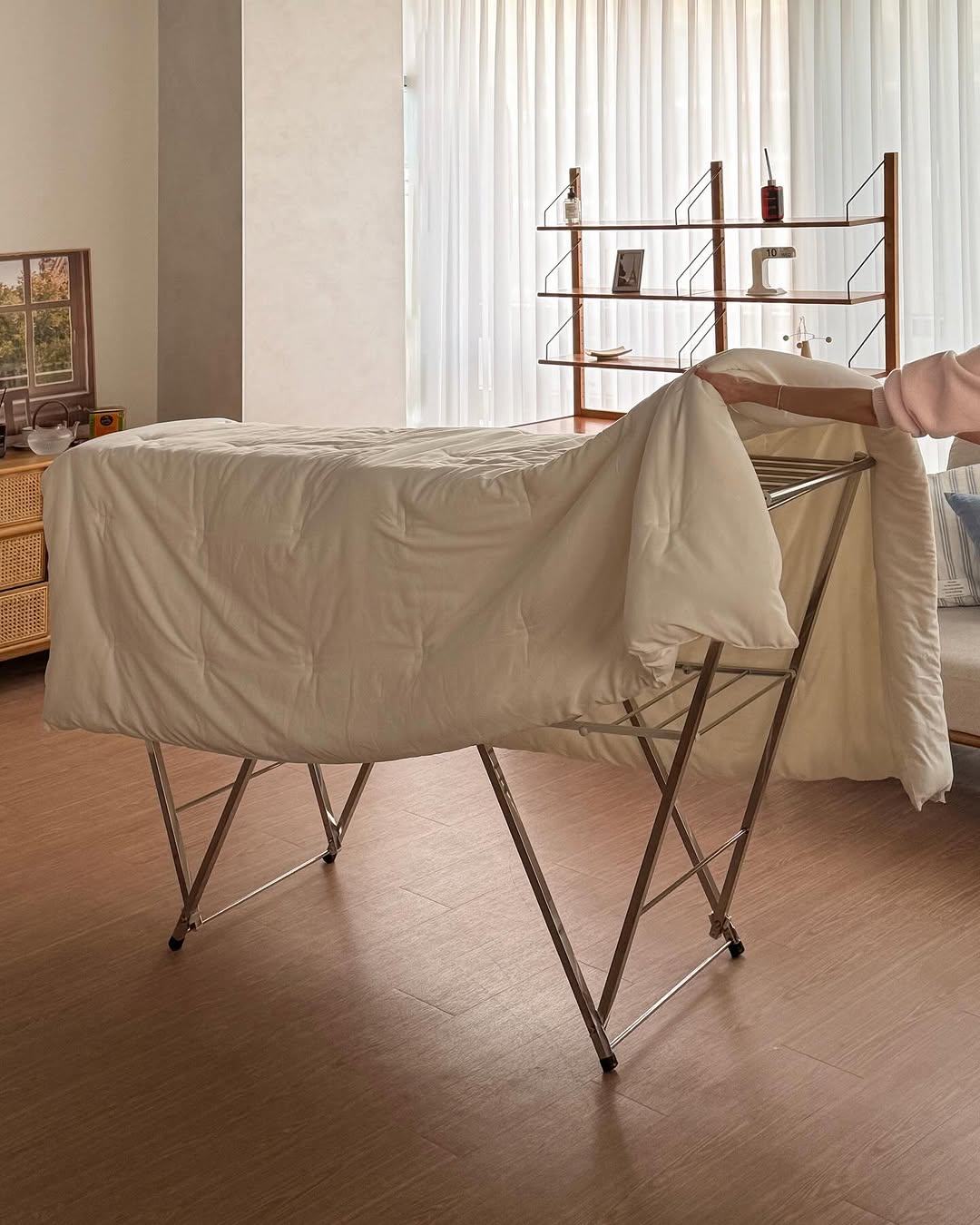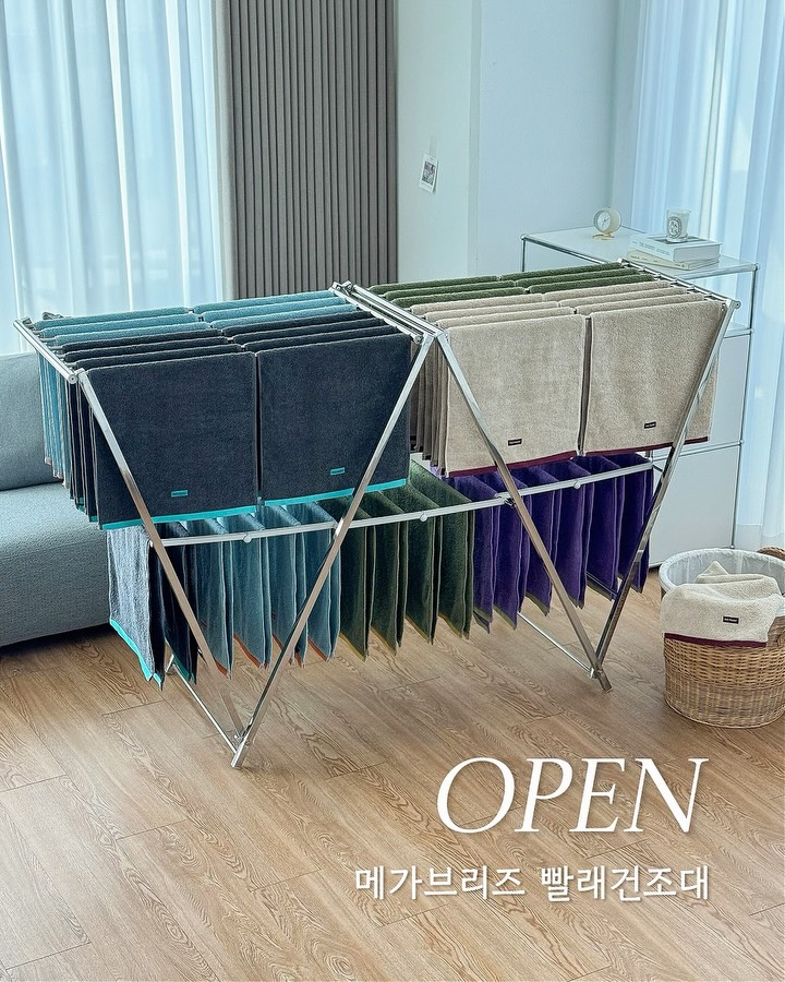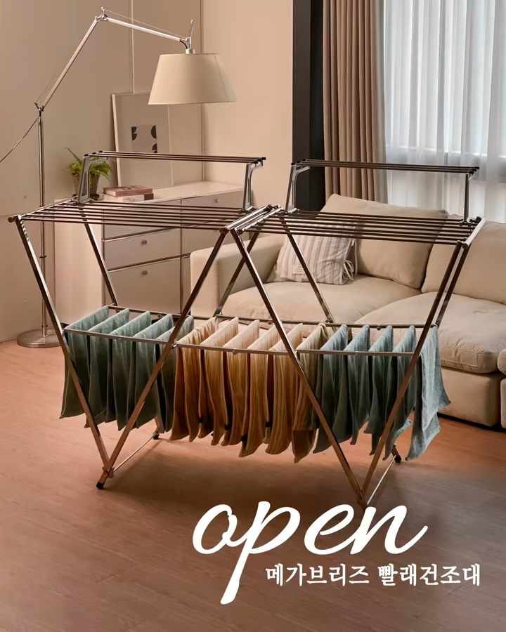 🧡메가브리즈 빨래건조대 공구예고 집에 있는 빨래걸이 흠집나고 삐걱거리고 녹물 묻어나서 버리신 분 많으시죠? 그 모든 스트레스를 덜어주는 304 스테인리스 빨래건조대예요 트리오 기준 수건 40장도 거뜬히 널 수 있는 넉넉한 사이즈에 국내에서 제작된 탄탄한 구조 펴고 접을 때도 힘 들지 않게 직관적인 구조로 되어 있어요 무엇보다 부피가 작아서 사용 안 할 땐 세워두기만 해도 정리 끝 좁은 공간에서도 부담 없이 쓸 수 있어요 깔끔한 스테인리스 바디라 집 안 어디에 두어도 지저분해 보이지 않고 오히려 정리된 인테리어 느낌이에요 디자인, 실용성, 내구성까지 챙겨서 거실이나 방에 두어도 괜찮아요 실용성과 미니멀함을 동시에 포유홈에서 특가로 만나보실 수 있게 준비했어요✨ 📌공구일정 📢 02월03일-02월07일(총 5일간) 📍빠른구매 원하시면 아래 흔적 부탁드려요 :)
