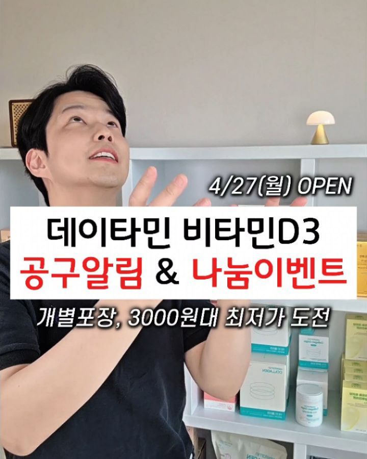 🔻공구알림 & 나눔이벤트 안내사항🔻 완벽한 품질에 합리적인 가격✨️ "데이타민 비타민D3 츄어블 2000iu" 🎉공동구매 알림과 나눔이벤트 진행합니다🎉 인체 필수 영양소 비타민D의 효과는 다들 아시죠 이러한 비타민D를 누구나! 부담없이! 섭취하실 수 있도록 만들어진 제품입니다 😃 ✅️ 이런 스펙을 가지고 있습니다 ▪️ 세계 1위 비타민D 원료사 DSM원료 ▪️ 생체 이용율이 높은 비타민D3 형태 ▪️ 산패 방지를 위한 개별 포장 ▪️ 1알당 2000iu 가득찬 함량 ▪️ 파인애플맛 맛있는 초소형 츄어블 ✅️ 이런 분들께 추천 드립니다 ▪️ 몸의 방어시스템 정상화가 필요하신 분들 ▪️ 환절기만 되면 고생하시는 분들 ▪️ 잦은 트러블로 스트레스 받으시는 분들 ▪️ 골격 형성이 필요한 성장기 청소년 ▪️ 골밀도 유지가 중요한 임산부, 수유부 ▪️ 골다공증 위험이 높은 중장년층 이상 ▪️ 햇빛 아래 활동이 부족하신 분들 ✅️ 적정 섭취량 ▪️ 성인 기본용량 : 식사 후 1캡슐 ▪️ 성인 결핍 시 : 1일 2캡슐 ▪️ 돌 이전 : 주 1회 ▪️ 초등 이전 : 이틀에 한번 ▪️ 초등 이후 : 이틀에 한번 ~매일 ✅️ 공동구매 구성 ✔️ 3박스 (총 270캡슐) : 정가 72,000 >> 공구가 43,500 (40%, 1통 14,500) ✔️ 6박스 (총 540캡슐) : 정가 144,000 >> 공구가 75,500 (48%, 1통 12,583) ✔️ 9박스 (총 810캡슐) : 정가 216,000 >> 공구가 102,500 (53%, 1통 11,389) ✅️ 공구알림 이벤트 ▪️ 공구알림 남겨주신 10명(열 분) ▪️ 회사에서 랜덤 추첨해서 선물 보내 드리겠습니다. ✅️ 공동구매는 4/27(월) ~ 1주간 예정 입니다. ➡️ "이번에만" 첫공구 런칭기념 추가 할인도 있으니 ➡️ 4/27(월) 공동구매도 많은 관심 부탁드립니다! 항상 함께해주셔서 감사드립니다 @yak_secret #비타민D #비타민D3 #비타민D나눔 #비타민D공구 #비타민D추천 Q) 비타민D 얼마나 드시고 계신가요?
