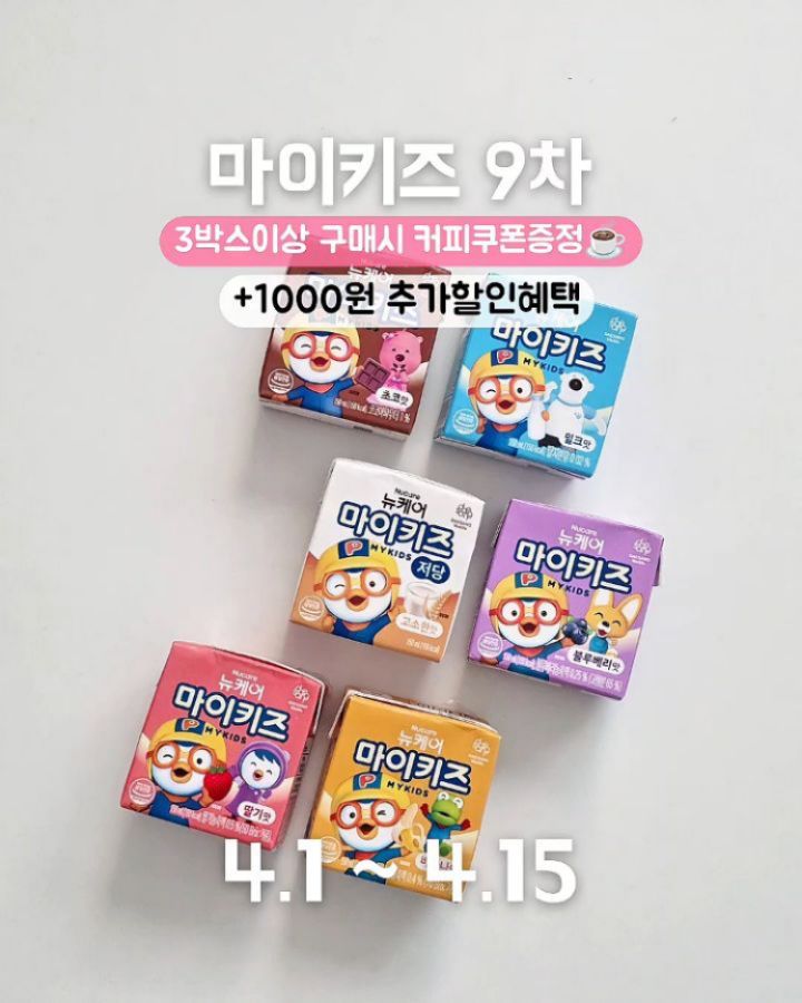 4월도 혜택 챙겨왔어유~ 마이키즈🌸 커피쿠폰부터 할인쿠폰까지 챙겨가세요 : ) ✅️ 구매완료이벤트 (20명 추첨) ✔️3박스이상 구매 후 "구매완료" 댓글을 남겨주세요. ✔️공구마감 2주 후 커피쿠폰 발송됩니다. --- 3월에는 새학기 시즌이라 그런지 주문이 역대급으로 많았어요! 우리 아이 영양간식으로 챙겨주기 좋으니 당 많은 음료말고 마이키즈 챙겨주세요🥛 특히 편식 심한 아이라면 추천드려요. 1팩에 성장, 발달에 필요한 영양소가 골고루 함유되어 있어요☺️ ✔️성장기 어린이 필수아미노산 9종 모두 함유! ✔️엄마들의 걱정을 줄인 당함량과 유당불검출 ▶️ 유통기한안내 마이키즈(딸기맛) 2026.11.30 마이키즈(초코맛) 2026.12.10 마이키즈(밀크맛) 2026.12.08 마이키즈(블루베리맛) 2026.11.09 마이키즈(바나나맛) 2026.11.19 마이키즈(저당고소) 2026.12.19 육아는 매일이 선택의 연속이잖아요! 아이 영양 걱정 하나 덜어보세요~ 프로필링크에서 구매 가능합니다❣️ #마이키즈 #마이키즈공구