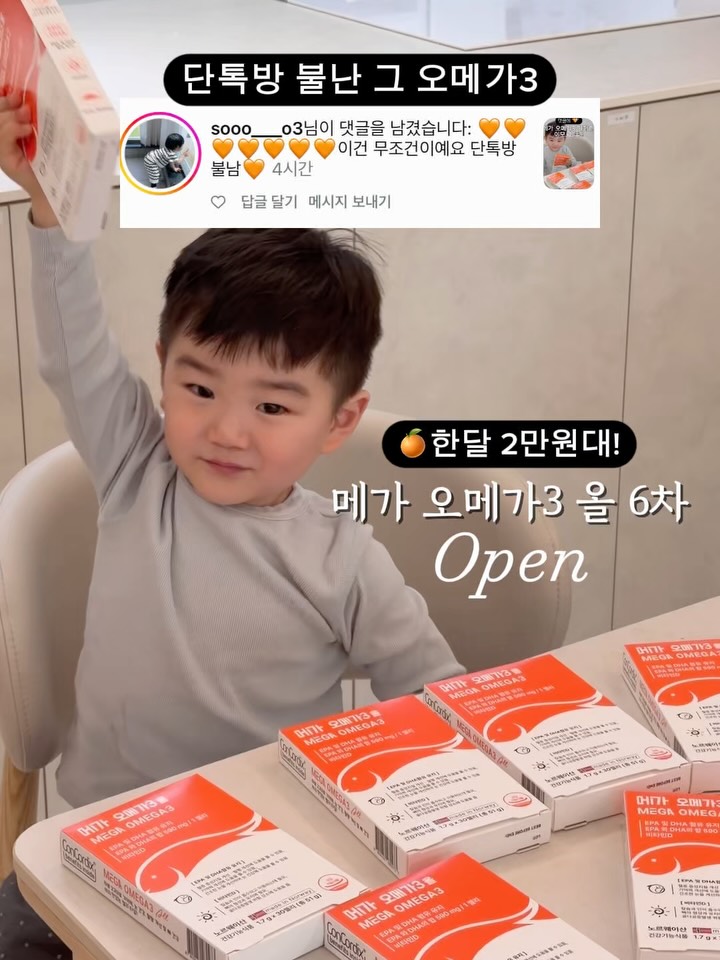 도대체 이게 뭐길래 이렇게 난리야!? 싶은 오메가 벌써6차!! 1년 넘게 공부해봐도 스펙이 이렇게 완벽한데 이 맛에 이 가격이 진짜 없어요!!! 여러분 힘들고 귀찮으니 제가 다 비교 해보고 데려온거 아시죠!! 🍊댓글에 ‘핫딜’ 남겨주세요 최저가로 구매 가능한 링크 바로 드려요!!!! (밤 10시 오픈!!) 🎁구매인증+폰 뒷네자리 남겨주세요 !!! 면력역에 좋은 엘더베리 빌베리 다섯분께 선물 드릴게요!!!! 🎁선착순 6박스 이상 50명에게 배도라지차 🍐 수도 없이 많은 오메가3 먹어봤는데요 가장 큰 장점은 바로 ✔️ 꾸준히 먹일 수 있는 부담 없는 가격! 한달에 2만원대! (타 제품은 돌이후 하루 권장량인 500mg을 먹이려면 두알, 세알 여섯알까지 먹어야 하는 제품이 대부분이였어요! 그러다보니 예를들어 한박스 3만원이라해도 결국은 6만원이되는거져! 메가 오메가는 딱 한알만 먹으면 하루 권장량을 충족해요!) ✔️끝맛이 비리지 않고 오렌지 맛으로 아가들이 스스로 찾아오다보니 깜빡잊을일이 적다!!!! ✔️당류는 0g 천연 오렌지 향으로 당 걱정 안해도되는데 물에도 녹을정도로 푸딩과 젤리 그 어느중간 정도의 질감이라 돌 이후 아가라면 잘 먹을 수 있어요! (이루는 10개월 부터 먹었어요!!) ✔️중금속 걱정 없는 청정지역 노르웨이 소형어류 사용!! ✔️산패 방지를 위한 개별 포장!! ✔️흡수가 잘되는 rTG 오메가!! 🔅오메가 3의 효능🔅 1. 기억력 개선 2. 눈건강 3. 혈행 개선 4. 열중중성지질 개선 에 도움이 될 수 있어요 📍오메가 3는 돌 전 후 부터 권장(이루는 10개월 정도부터 먹었습니다!!!) 📍메가 오메가를 성인이 먹을 경우엔 하루 두알,아이는 한알만 먹으면 돼요! 👉🏻공구기간 4.20(월) - 4.23(목) 밤 10시 오픈! 📍소비기한 2027년 6.1까지! 📍공구텀 3개월 이지만 중간 중간 나도 먹고 한개씩 더 주고 그러다 보면 꼭 모자라더라구요!! 다음 공구 날짜가 조금 뒷쪽일수도 있구요! 3-4박스 추천 드려요!! 📍권장 개월수 분유나 모유를 끊고 유아식을 시작하면 하루 권장량에 맞게 챙겨주기가 어렵거든요 !!돌 이후 부터 추천 드려요! 👉🏻배송 한통만 사도 무료배송 대한통운 오후 1시 결제완료건 당일발송