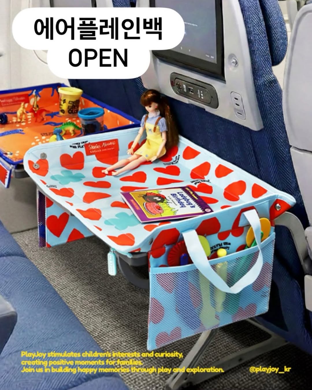 플레이조이에서 새로 출시한 에어플레인백은 비행기와 기차에서 사용할 수 있는 아이 전용 플레이존을 제공합니다. 테이블 고정밴드, 자석 모서리, 탈부착 스트랩 등 다양한 기능이 특징입니다.