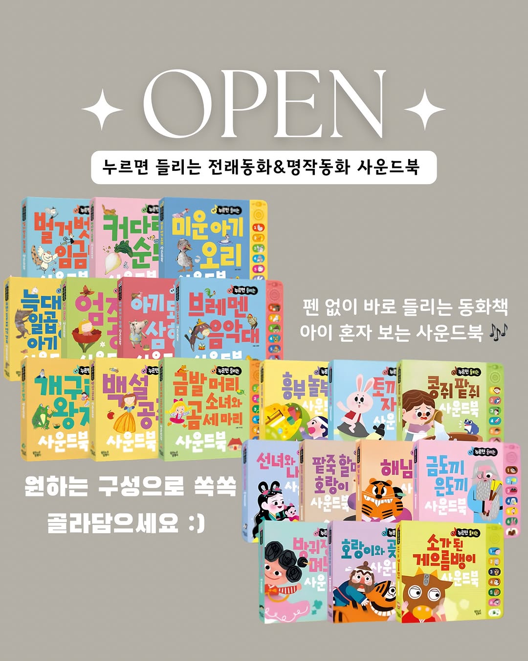 누르면 들리는 전래동화&명작동화 사운드북 골라담기 🎶 책 읽어달라고 가져오는데 끝까지 한 번에 가는 날 거의 없죠 😮💨 이건 버튼 누르면 바로 동화가 나오는 사운드북이에요! 침대에서 자기 전 차 안 이동할 때 혼자 조용히 놀 때 책 넘기면서 그림 옆 버튼만 누르면 해당 장면 이야기가 바로 이어져요 👀 ✔️ 페이지마다 6~7개 버튼 → 장면 골라서 반복해서 듣기 ✔️ 전래 + 명작동화 구성 → 질리지 않고 계속 꺼내보게 됨 ✔️ 전문 성우 음성 + 또렷한 소리 → 끝까지 집중해서 듣게 됨 한 번 누르기 시작하면 같은 장면도 계속 다시 듣고 혼자 넘기면서 보는 시간이 확실히 길어지더라고요 👍🏻 읽어달라고 찾는 횟수는 줄고 혼자 꺼내보는 횟수는 늘고 듣다 보니 말 따라하는 모습도 보이니 혼자 이야기 이어가는 모습도 생겨요 읽어줘야 보는 책이 아니라 혼자도 계속 보게 되는 책이예요! 🙂 한 권 가격이 1만원도 안 되는 구성이라 아이 좋아하는 이야기만 쏙쏙 골라 담기 좋고 여러 권 골라서 보시는 분들 많더라고요 👀 이번에 보시면서 아이 좋아할 만한 걸로 같이 골라보셔도 괜찮을 것 같아요 🙂 📕 전래동화 사운드북: 흥부놀부, 해님달님, 토끼와 자라, 콩쥐팥쥐, 선녀와 나무꾼, 소가 된 게으름뱅이, 팥죽 할머니와 호랑이, 금도끼 은도끼, 방귀쟁이 며느리, 호랑이와 곶감 📗 명작동화 사운드북: 아기 돼지 삼형제, 백설 공주, 미운 아기 오리, 개구리 왕자 늑대와 일곱 마리 아기 염소, 커다란 순무, 브레멘 음악대, 벌거벗은 임금님, 금발머리 소녀와 곰 세 마리, 엄지공주 📆 공구기간: -4/21 👉🏻 자세한 구성은 프로필 링크에서 확인해주세요 :)