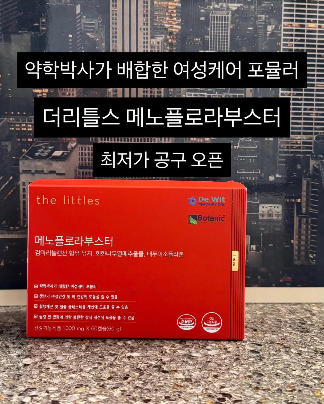 #공동구매 📌 여성이라면 반드시 드셔야하는 “ 더리틀스 메노플로라 부스터 ” 공구안내 알림드립니다📌 🎆일정 : 4월 17일 금요일 오전 10시 Open🎆 🎆 이벤트 안내 : 구매 완료 후 댓글로 ”구매완료 + 휴대폰 뒷번호 4자리“ 남겨주세요! 안녕하세요! 예삐 남편 형제약사입니다~ ㅎㅎ 최근에 올린 영상에 많은 분들이 관심을 가지면서 - 감마리놀렌산 - 회화나무열매 추출물 - 대두이소플라본 이 3가지 성분들이 포함된 영양제를 물어보시더라구요. 그래서 준비했습니다 ! 더리틀스 메노플로라 부스터! 이런 분들에게 추천드립니다 👋약학박사가 배합한 여성케어 포뮬러 👋 갱년기 여성건강 및 뼈 건강에 도움을 줄 수 있음 👋 혈행개선 및 혈중 콜레스테롤 개선에 도움을 줄 수 있음 👋 월경 전 변화에 의한 불편한 상태 개선에 도움을 줄 수 있음 ===================== 이 제품의 특징은요! 👋 약학박삭가 직접 설계한 핵심 배합! 갱년기, 뼈 , 혈행, 피부 , 월경전 불편함을 한번에 ! 👋 감리놀렌산 240mg 함유 되어있음! 감마리놀렌산은 월경전 불편함 개선, 혈중 콜레스테롤 개선, 혈행개선, 생기있는 피부까지 모두 해결해주는 핵심 성분이에요. 👋 대두이소플라본 24mg 뼈 건강에 도움을 줄 수 있구요 👋 회화나무열매추출물 350mg 갱년기 여성의 건강에 도움됩니다 ===================== 자주 묻는 질문 ! 👋 어떻게 섭취? => 1알씩 2번 or 2알씩 1번 식후에 드세요! 👋 언제 섭취? => 식후에 드세요 👋 임산부 섭취? => 임산부 및 수유부는 권하지 않습니다 👋 갱년기 여성만 섭취 ? => 여성 및 청소년 나이와 상관없이 모두 섭취 가능! 하루에 2알씩 1번 드시면 되구요! ===================== 소비기한 : 2027.05.06 까지 ===================== 📌프로모션 안내📌 📍1박스 = 60정 , 1개월치 입니다 입니다🔅🔅 2박스(2개월분) 90,000원➡️ 61,800원 31% off (1박스= 30,900원) 4박스 (4개월분) 180,000원➡️ 119,600원 34% off (1박스= 29,900원) 6박스 (6개월분) 270,000원➡️ 159,000원 41% off (1박스 26,500원) 가족, 친구들과 모아서 구매하시면 더 저렴하고 좋아요.