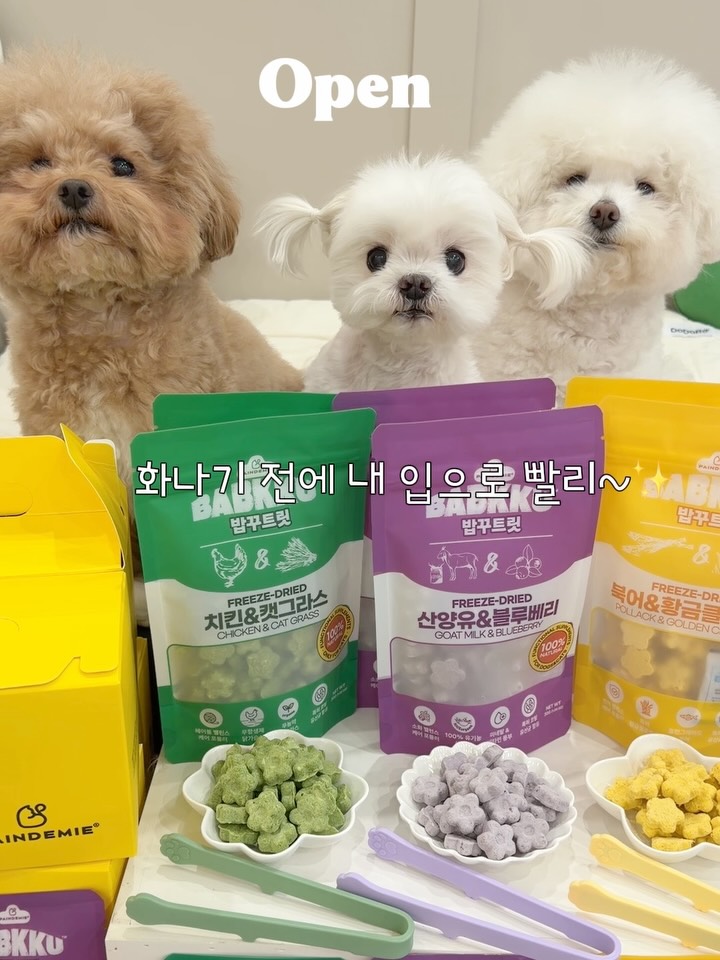 . 잠시 후 오전 10시 오픈 ─────────────── 🎟️ 순덕삼 공구 해택(피드 내용❌ 👉🏼 수정됨) 1️⃣ 모든 구매자 미니트릿 1봉 제공 2️⃣ 밥꾸트릿 30g 본품 X4개 이상 구매 시 👉🏼 버라이어티팩 믹스 제공 3️⃣ 제품 3종 이상 구매 시 👉🏼 밥꾸 미니트릿 4종 + 밥꾸 집게 제공(컬러 랜덤) ✔️집게는 재고 소진 시 종료 📌 스토어 알람받기 👉🏼 할인 받고 구매하세요 간식 줄 때마다 걱정 No! 간식을 아예 안 주려니 견생 너무 쓸쓸할 거 같잖아요?🥲 그래서 늘~ 건강하게 만든 간식을 주려 노력해요 휴먼 그레이드 이상의 원물 100% 사용하고, 성분 단순하고 깔끔한 간식을 소개할게요 ─────────────── 🎟️ 소문내기 이벤트 🎁10분께 버라이어티팩 선물 방법 👉🏼 본 피드를 스토리 공유 + ‘공유완료’ 댓글 남기기 (@sun_sim_ 태그 필수, 리스트 취합 가능) ─────────────── ✅ 팡드미 밥꾸트릿 ☑️ 동결 건조 공법 원물의 형태와 영양 성분을 최대한 보존 기호성 높음 ☑️ 인공 첨가물 O% 항생제, 인공색소, 인공 감미료, 충전제, 방부제, 기호성 증진제❌ ☑️100% 휴먼 그레이드 사람이 먹는 식품 등급의 재료 100% 사용 ☑️ 까다로운 FDA에 정식 등록된 생산 시설에서 국내 제조 ☑️ 6개월마다 나라에서 지정한 검사기관에 의뢰해 안정성과 품질검사 ☑️ g당 특허 코팅된 100억 유산균 투입 (SP 코팅) (다당류 코팅 + 단백질 코팅 + 호박 코팅 유산균) ─────────────── ✅ 라인업 🟢 치킨&캣그라스 ✔️ 무항생제 냉장 닭가슴살, 무농약 밀싹, 치커리 식이섬유, 특허 호박 코팅 유산균 - 소화 촉진 (고양이 헤어볼 배출) - 풍부한 단백질로 근력 강화 및 비만에 도움 - 장운동을 도와 변비 완화 및 소화 촉진 🟣 산양유 블루베리 ✔️유기농 산양유, 고구마, 블루베리, 무가당 플레인 요거트, 치커리 식이섬유, 특허 호박 코팅 유산균 - 면역력 개선 - 비타민A, C, E와 안토시아닌 함유로 눈건강 도움 - 풍부한 단백질로 근력 강화 및 비만에 도움 - 장운동을 도와 변비 완화 및 소화 촉진 🟡 북어&황금 클로렐라 ✔️북어, 전란(계란), 황금 클로렐라, 치커리 식이섬유, 특허 호박 코팅 유산균 - 뼈 건강에 도움 - 면역력 강화, 기력 회복에 도움 - 풍부한 단백질로 근력 강화 및 비만에 도움 - 장운동을 도와 변비 완화 및 소화 촉진 🔴 열빙어&크랜베리 ✔️열빙어, 전란(계란), 비트분말, 크랜베리, 치커리 식이섬유, 특허 호박 코팅 유산균 - 칼슘, 미네랑 풍부해서 뼈•관절에 영양 - 프로안토시아닌이 요로 감염 예방에 도움 - 풍부한 단백질로 근력 강화 및 비만에 도움 - 장운동을 도와 변비 완화 및 소화 촉진 클릭! ─────────────── ⏱️8일 수요일 10시 오픈 ~ 11일 토요일 밤 12시까지 📌 구매는 프로필 링크 클릭! #순덕삼공구