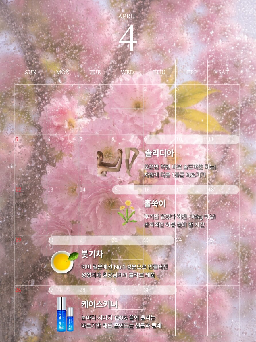🌸 완연한 봄 4월 일정 🌸 올해 4월부터… 갑자기 확 더워진대요😳 이 말이 뭐냐면..? 이제 옷으로 가릴 수 있는 시즌 끝이라는 뜻! 🎁 가장 기대되는 제품 댓글에 남겨주신 분들 중 추첨해서 스타벅스 기프티콘 보내드릴게요~! 그래서 이번 달은 “여름 준비 완성 루틴”으로 딱 맞춰서 준비했어요. 4월 들레 일정만 따라오면 5월 들어가기 전에 몸이 확 달라집니다✨ ⠀⠀⠀ ✅ 4/9–4/12 | 솔리디아 오픈만 하면 바로 솔드아웃 되는 이유 있는 제품. 차원이 다른 1등급 의료기기 라인 케어 단 한 번 착용만 해도 바로 체감 오는 그 느낌. 날씨 더워질수록 다리 라인 제일 먼저 드러나는 거 아시죠? 이번에 안 하면 타이밍 놓칩니다🔥 ✅ 4/15–4/19 | 🌼홀쑥이🌿 홀쑥이는 말해뭐해…. 진짜 특허 받은 건 다르다는 걸 느끼실거예요😎🤫 이제는 진짜 본격 여름 준비 들어갈 타이밍. 다른데로 잠깐 건너가더라도 “왜 다들 결국 돌아오는지” 바로 느끼실 거예요. 여름 대비는 무조건 여기서 시작입니다🔥 ✅ 4/20–4/23 | 부ㄲ 1차 드디어 나온다!!!! 이미 일본에서 No.1 성분으로 인정받은 조합. 거기에 압구정 🏥에 이미 쫙..깔리기로 예정이 끝난 진짜가 옵니다✨ ✅ 4/27–4/30 | 케이스키니 눈바디 시너지 100% 끌어올리는 마지막 단계. 바르기만 해도 쎌룰·둘레가 정리되는 느낌. 4월 마지막, 눈으로 보이는 변화까지 완성 가보자구요🫢 🌙 4월은 ‘여름 몸 만드는 시작점’이에요. 🔻 지금 시작하면 5–6월에 진짜 편해지고, 🔻 지금 미루면 올 여름도 작년과 똑같을 거예요…🥲 이번 달도 들레랑 같이 제대로 준비해요💚