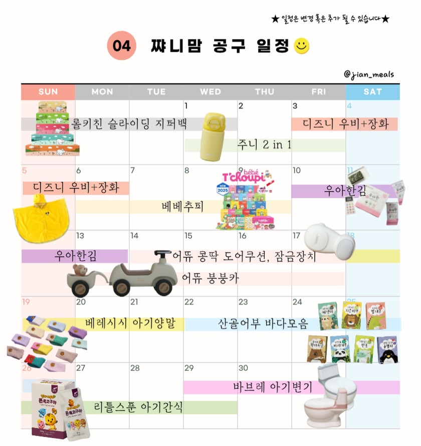 4월 일정 왔숩니당📣 이번에도 제가 정말 잘쓰고 좋아하는 제품들로만 구성해왔으니 많은 관심 부탁드려요?❤️ ﹏﹏﹏﹏﹏﹏﹏﹏﹏﹏﹏﹏ 💌이벤트💌 🌼기대 이벤트 ❤︎4월 공구 제품 중 가장 기대되는 제품을 댓글로 남겨주시면 추첨을 통해 한분께 커피 기프티콘 보내드려요😆 💌해당제품 오픈될 때 링크도 보내드려용📣 ﹏﹏﹏﹏﹏﹏﹏﹏﹏﹏﹏﹏ 📍롤키친 슬라이딩 지퍼백 ✔️비닐대란? 그래도 가져온 지퍼백모음!! 아기 어린이집보내는 준비물부터 음식까지 보관용으로는 이만한 지퍼백 없어요! 📍주니 2in1 ✔️텀블러 하나로 2가지를?! 빨대텀블러샀다가 다시 또 일반텀블러 사기 아까우신분들을 위해..! 주니 2in1을 가져왔어요! 근데 이게 곧 단종이래요.. 어여 구하세요! 📍디즈니 우비 + 장화 ✔️작년에도 비가 많이왔는데 올여름도 얼마나 올지.. 우비랑 장화 챙겨두셔야하잖아요?!?! 근데 게다가 색감쨍한 디즈니...? 못참지.. 당장 구매해야해요! 📍베베추비 ✔️추피지옥 아시죠?! 그전에 아기들의 소근육을 길러주는 베베추피 어떠세요 ? 지안이도 혼자 앉아서 계속 읽는 베베추피 진짜 추천드려요 📍우아한김 ✔️밥태기? 김으로 때려뿌셨습니다.. 게다가 김, 국, 보리차, 튜브죽까지 다양하게 준비했으니 아기 밥태기 같이 부셔봐요! 📍어뜌 붕붕카 ✔️우리 이제 5/5 어린이날 준비해야하잖아요.. 지안이에게 어린이날 선물로 준비해준 붕붕카.. 너무 좋아해서 내려오지를 않아요.. 게다가 붕붕카 하나가 아닌 4in1기능이 되어서 다양하게 즐길 수 있답니다? 📍어뜌 콩딱 도어쿠션, 잠금장치 ✔️이제 아기들 문닫죠,,, 문에 손이 끼어서 얼마나 울었는지.. 그리고 자꾸 서랍 다 열고 다꺼내고.. 우리 이제 도어쿠션과 잠금장치설치해서 사고방지해요.. 📍베레시시 아기양말 ✔️색감쨍하고 예쁜 양말 찾는 엄마 다모여라!! 봄이 왔으니 우리 양말 이쁘게 신어야하잖아요? 베레시시 만한게 없다고 봅니다.. 봄에 어울리는 양말 구해가세요!! 📍산골어부 바다모음 ✔️우리 아기들에게 해조류도 많이 먹여야하는데.. 왜이렇게 해조류는 어려울까요? 그 고민을 모두 해결해줄 산골어부의 바다모음..!! 미역, 매생이, 파래가루, 톳, 황태, 멸치 까지 진짜 다양하게 준비했어요 📍리틀스푼 아기간식 ✔️지안이랑 어디가더라도 늘 챙겨다니는 고구마간식.. 리틀스푼 고구마스틱이에요! 이거 하나면 엄마 식사 자유시간 가능합니다.. 게다가 첨가물없는 떡뻥까지 같이와요! 📍바브레 아기변기 ✔️우리 아기들 이제 슬슬 기저귀 떼야하잖아요.. 변기랑 소변기 정말 많은 고민하다가 바브레로 정착했어요.. 가격도 저렴하고 정말 좋더라구요? 우리 같이 기저귀떼기 프로젝트 들어가시죠!!