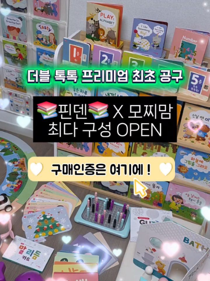 🍀핀덴 x 모찌맘 최초 공구 구성🍀 🗓4월 28일 오전 10시 오픈🗓 🔥역대 최저가 + 최다 혜택🔥 가격 및 사은품 구성은 옆 피드에 정리해놨어요 !➡️ - 🚨링크 필요하신분들은 댓글에 '링크'적어주세요🚨 🚨DM으로 구매링크 보내드릴게요!🚨 - 모찌맘 공구에서만 핀덴 최다 구성 모음전으로 진행합니다 🙂 10-20% 이런 ❌️할인율아니고❌️ 🔥최대 55% 할인🔥 믿어지십니까 ?! ㅋㅋ 저도 가격 조율중에 속으로 놀란부분 . . 이렇게까지 최저가로 내려주신다고요 ? 땡큐❤️ - 📌라인업📌 ✅️핀덴톡톡(프리미엄)+톡톡미니 풀세트 ✅️핀덴톡톡(프리미엄) ✅️톡톡미니 ✅️행복아이(감성/활동) ✅️아기감성그림책+말놀이그림책 ✅️아기감성그림책 ✅️말놀이그림책 ✅️사운드카 ✅️한글/영어 낱말카드 ✅️핀덴카 - 🍀핀덴톡톡(프리미엄)+톡톡미니 풀세트 사은품🍀 ✅️선착순 7명 🎁15만원 상당 핀덴카 증정🎁 ✅️구매자 전원 🎁7만원상당 잼잼차트 증정🎁 ✅️구매자 전원 🎁4만원 상당 한글낱말카드 풀세트 증정🎁 ✅️구매자 전원 🎁4만원 상당 영어낱말카드 풀세트 증정🎁 ✅️구매자 추첨 총 10분께 🎁네이버페이 1만원권 증정🎁 ✅️구매 금액별 🎁상품권 증정🎁 🍀핀덴톡톡(프리미엄) 사은품🍀 ✅️구매자 전원 🎁4만원 상당 한글낱말카드 풀세트 증정🎁 ✅️구매자 전원 🎁4만원 상당 영어낱말카드 풀세트 증정🎁 ✅️구매 금액별 🎁상품권 증정🎁 🍀핀덴톡톡(프리미엄) 사은품🍀 ✅️구매자 전원 🎁4만원 상당 한글낱말카드 풀세트 증정🎁 ✅️구매 금액별 🎁상품권 증정🎁 - 💵구매 금액별 상품권 증정(소전집 포함)💵 ✔ 30만원 이상 구매시 🎁신세계 상품권 2만권 증정🎁 ✔ 20만원 이상 구매시 🎁신세계 상품권 1만권 증정🎁 ✔ 10만원 이상 구매 시 🎁신셰계 상품권 5천원 증정🎁 ✨️풀세트 사은품만 30만원상당✨️ 진짜 이게 무슨일이쥬.. 혜택이 어마어마합니다 ! ! 기다려주신 만큼 최다 혜택으로 돌아왔어요.❤️ 📢 아쉬운 소식.. 핀덴톡톡(프리미엄)+톡톡미니 풀세트는 🔥한정수량 50세트🔥로 진행돼요ㅠㅠ 모찌맘이 최초로 진행하는 핀덴톡톡 프리미엄은 단독 공구로 다른 공구에서는 구매 하실 수 없어요.😭 필요하셨던 분들은 혜택 꼭 받아가세요 ?!❤️ - 📚핀덴톡톡📚 언어발달부터 기초 수학개념, 생활습관 전집이에요. 💡책 <> 교구 연계 학습가능💡 📚핀덴톡톡 쌍둥이 책 = 톡톡미니(영어버전)📚도 함께 노출 가능해요. 영어 노출때문에 따로 책 굳이 구매안하셔도 핀덴으로 커버 가능합니다.😉 한글책 읽어주고, 영어책도 함께 노출해줌으로써 ⬆️시너지 효과 UP !⬆️ 👉최소 연령 : 6개월부터 ✨️책 + 교구 + 카드 + 음원✨️ 등 다양한 방법으로 더 많은 노출을 해줄 수 있는 전집이에요. 👉책 따로 👉교구 따로 👉카드 따로 👉음원CD 따로 따로 따로 찾아서 살 필요없다 이거죠 ❤️ - 핀덴톡톡 프리미엄+톡톡미니 풀세트가 🔥정가 40만원대인데..🔥 앞자리 두번 바뀌어서 ❤️20만원대❤️에요. 299,000원 이런 가격 아니고ㅋㅋ 20만원 중반대입니다.👨🏫 필요하셨던 분들은 혜택 꼭 받아가세요 ?! - 📢 핀덴의 모든 제품은 핀덴카를 이용하여 음원 듣기 가능합니다😉 (스토리+챈트) - 📌 공구일정 📌 4월 28~30일 ✔️전구성 무료배송 ✔️주문일로부터 2~3일 이후 출고 예정 (최대한 빠르게 보내드립니다) ✔️제주,산간지역 추가 배송비 발생 ✔️브랜드 사정에 따라 출고일 1-3일 지연 가능성 있음 - 📌구매링크📌 프로필링크 참고하세요 ! - 📌구매인증 이벤트📌 댓글에 '구매완료/폰뒷자리' 적어주세요. N분 추첨통해 🎁네이버페이 5000원권🎁 선물드려용!